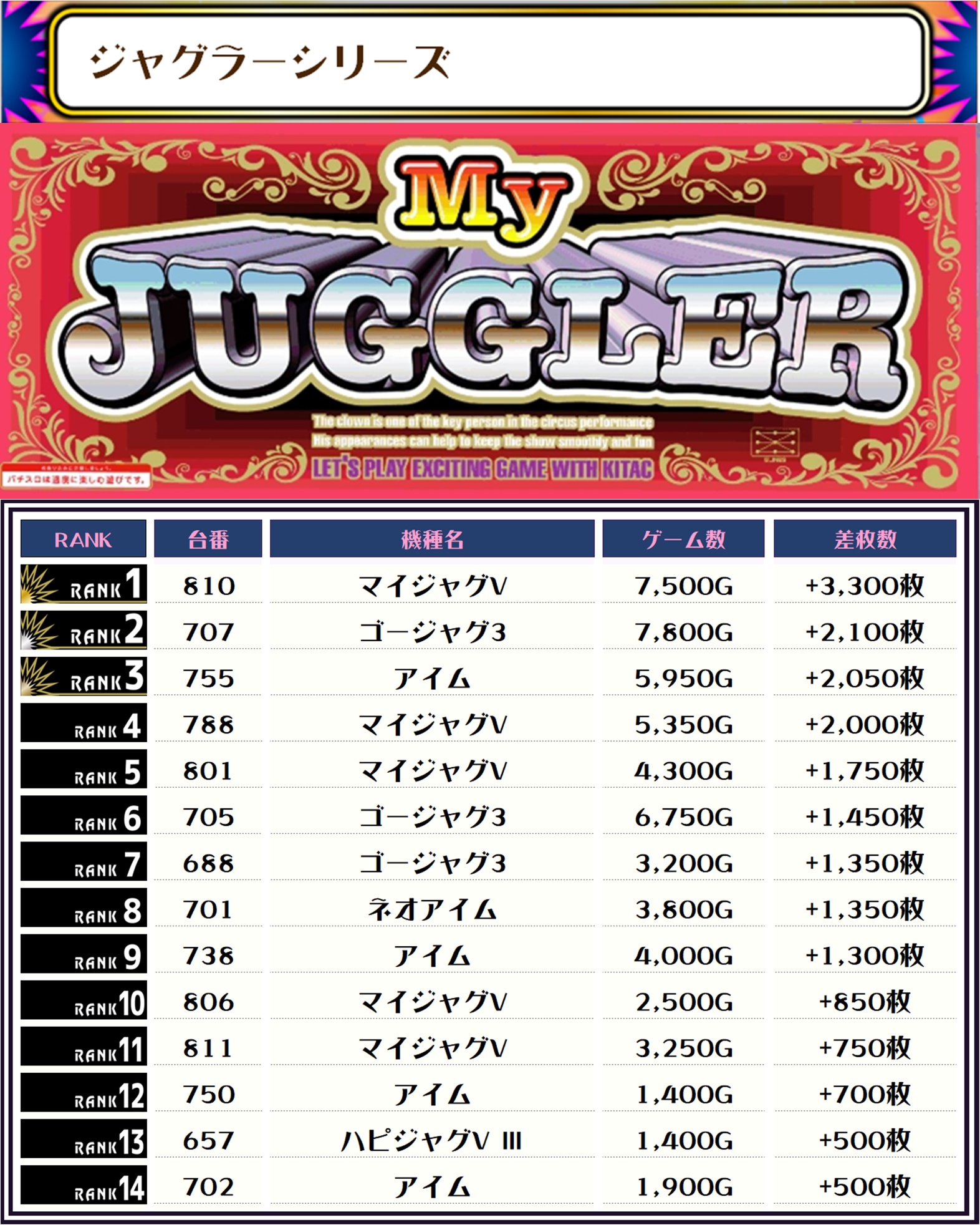 この日のジャグラーシリーズ全体TOPは【マイジャグV・810番台】で+3,300枚‼️