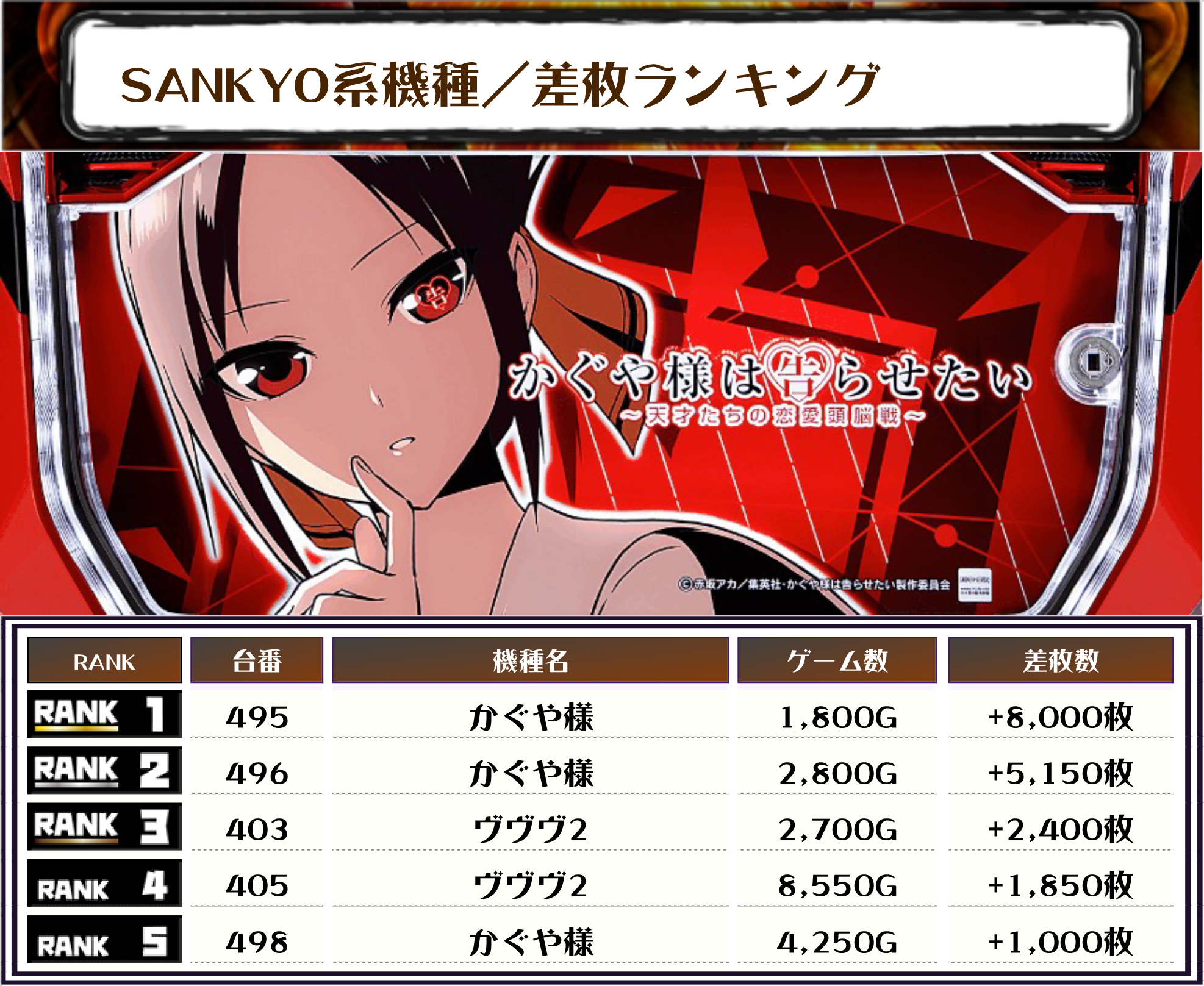 続く2位にも【かぐや様・496番台】の+5,150枚、そして3位には【ヴヴヴ2・403番台】の+2,400枚がランクインっ‼️