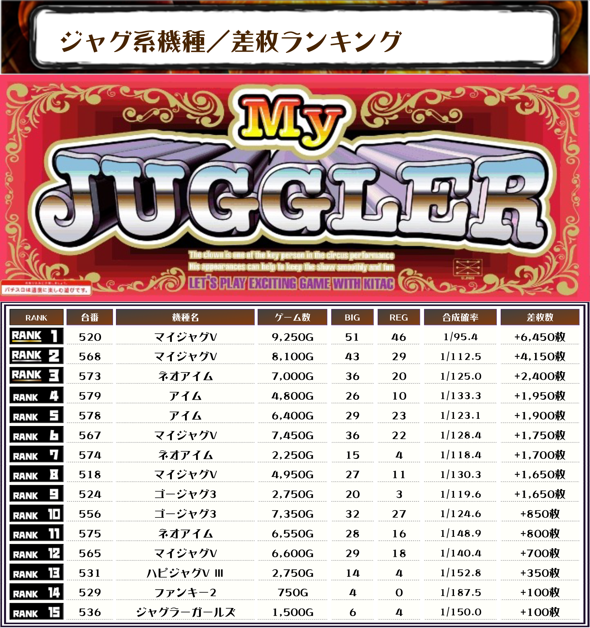 前回の差枚ランキングでも上位に多数ランクインしていたマイジャグVを攻めるのが王道の立ち回りでしょうか…🤔
