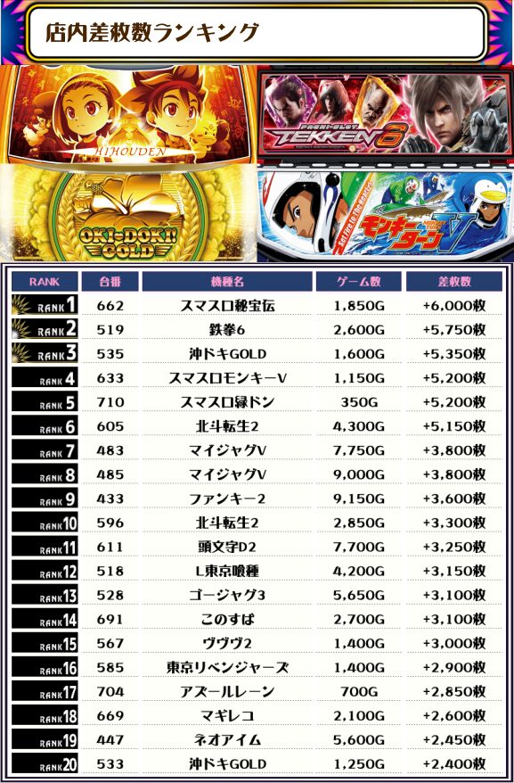 続く2位には【鉄拳6・519番台】の+5,750枚、そして3位には【沖ドキGOLD・535番台】の+5,350枚がランクインっ🏆🏆🏆🏆