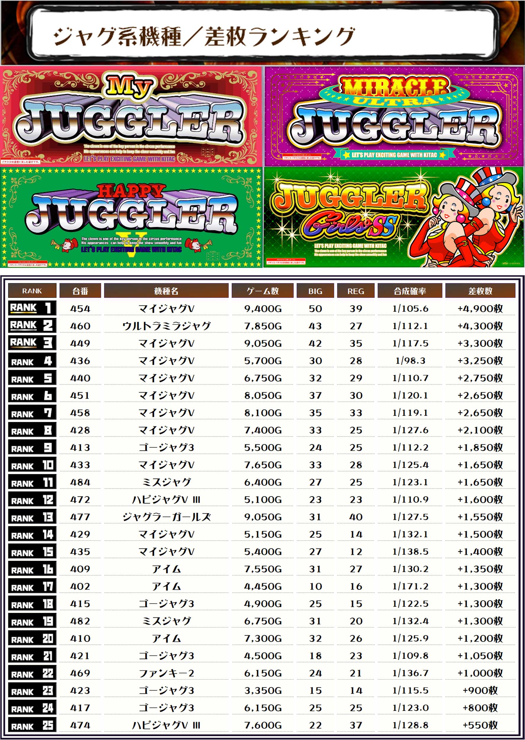 2位には【ウルトラミラジャグ・460番台】の+4,300枚、そして3位には【マイジャグV・449番台】の+3,300枚がランクインっ📷
