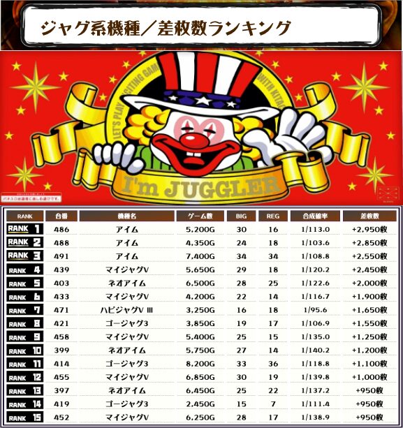 過去の傾向を見ると、マイジャグ・アイム・ゴージャグといった多台数機種を中心に、各機種まんべんなく優秀台が飛び出ている印象です👀