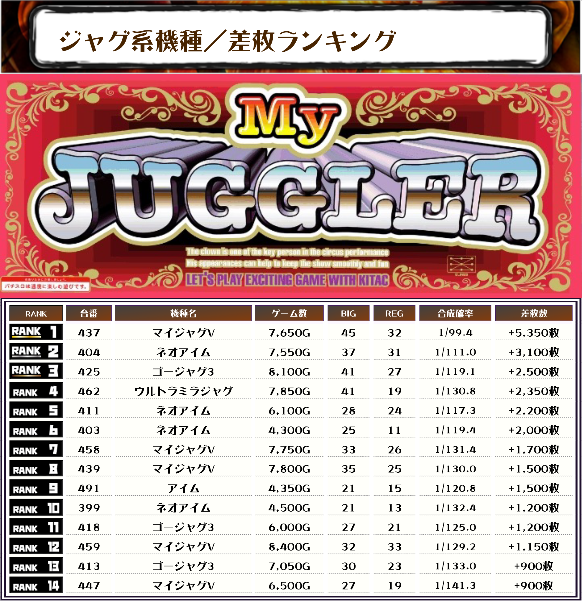 2位には【ネオアイム・404番台】の+3,100枚、そして3位には【ゴージャグ3・425番台】の+2,500枚がランクインっ📷