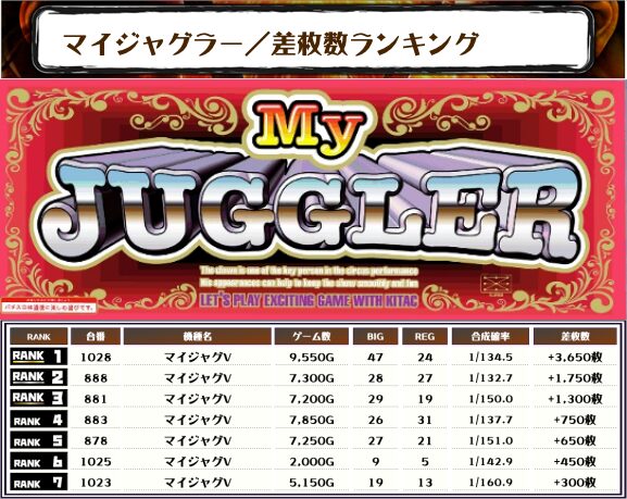 また、2位には【マイジャグV・888番台】の+1,750枚、3位には【マイジャグV・881番台】の+1,300枚がランクインっ🏆️