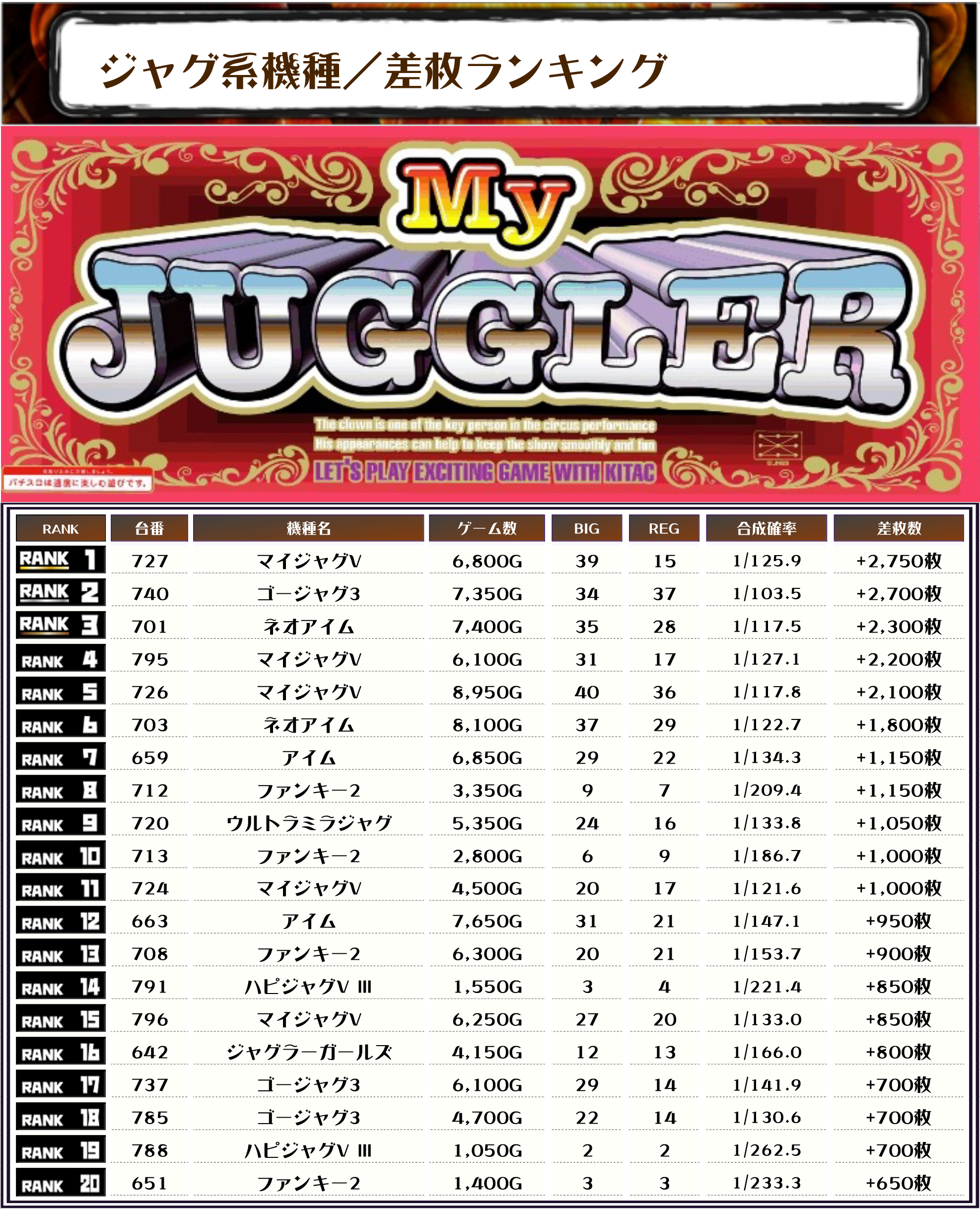 上位にマイジャグV・アイム&ネオアイムが目立つランキングとなりました‼️