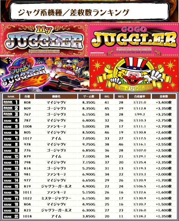 また、2位にはゴージャグ3・809番台】+3,350枚、3位にも同じく【ゴージャグ3・767番台】の+3,250枚がランクインっ