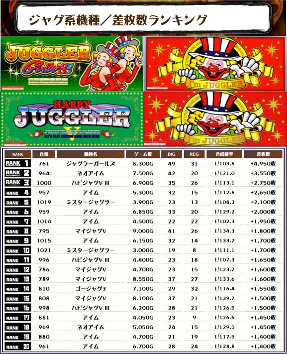 この日のトップ差枚は【ジャグラーガールズ・761番台】の+4,950枚