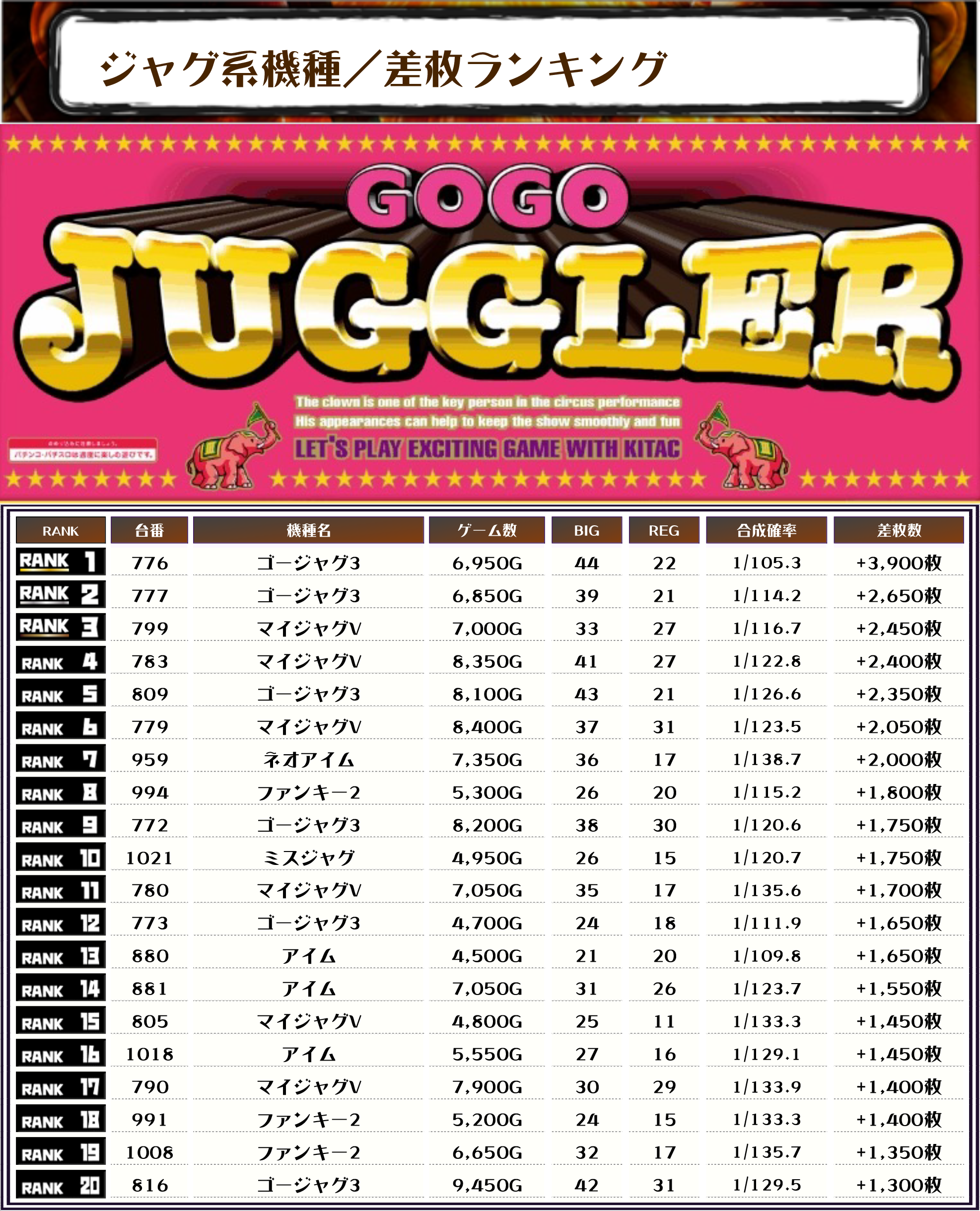 また、2位にも【ゴージャグ3・777番台】の+2,650枚、3位には【マイジャグV・799番台】の+2,450枚がランクインっ🏆️