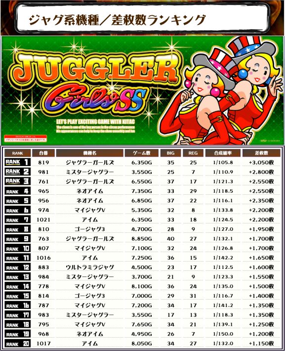 また、2位には【ミスタージャグラー・981番台】の+2,800枚、そして3位には【ジャグラーガールズ・761番台】の+2,550枚がランクインっ🏆️