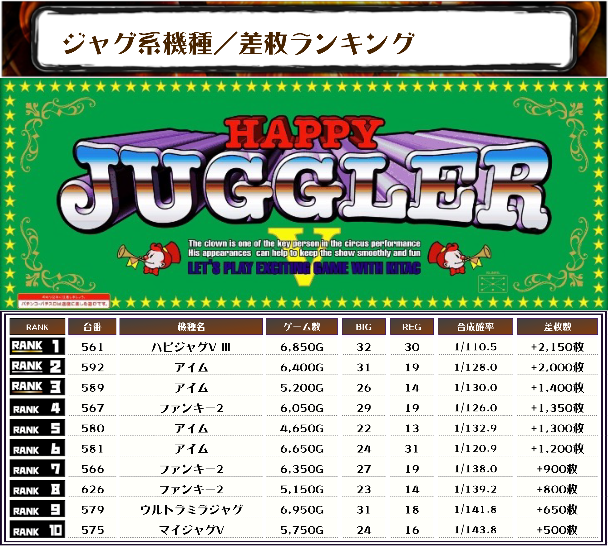 この日のトップ差枚は【ハピジャグVⅢ・561番台】の+2,150枚