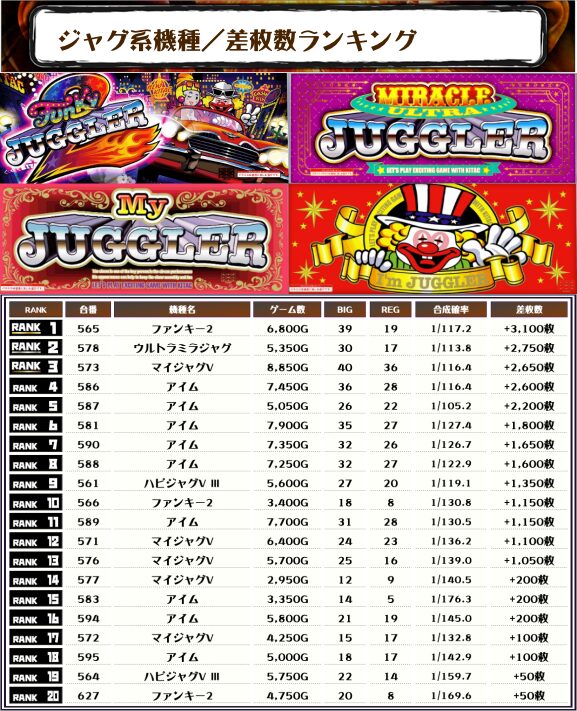 また、2位には【ウルトラミラクルジャグ・578番台】の+2,450枚、3位には【マイジャグV・573番台】の+2,650枚がランクインっ