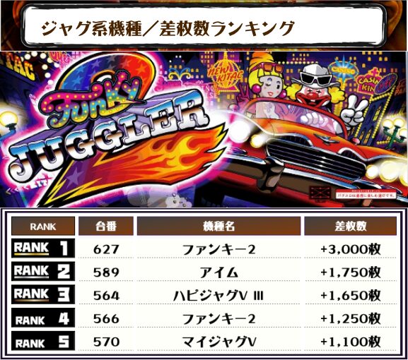 また、2位には【アイム・578番台】の+1,750枚、3位には【ハピジャグVⅢ・564番台】の+1,650枚がランクインっ