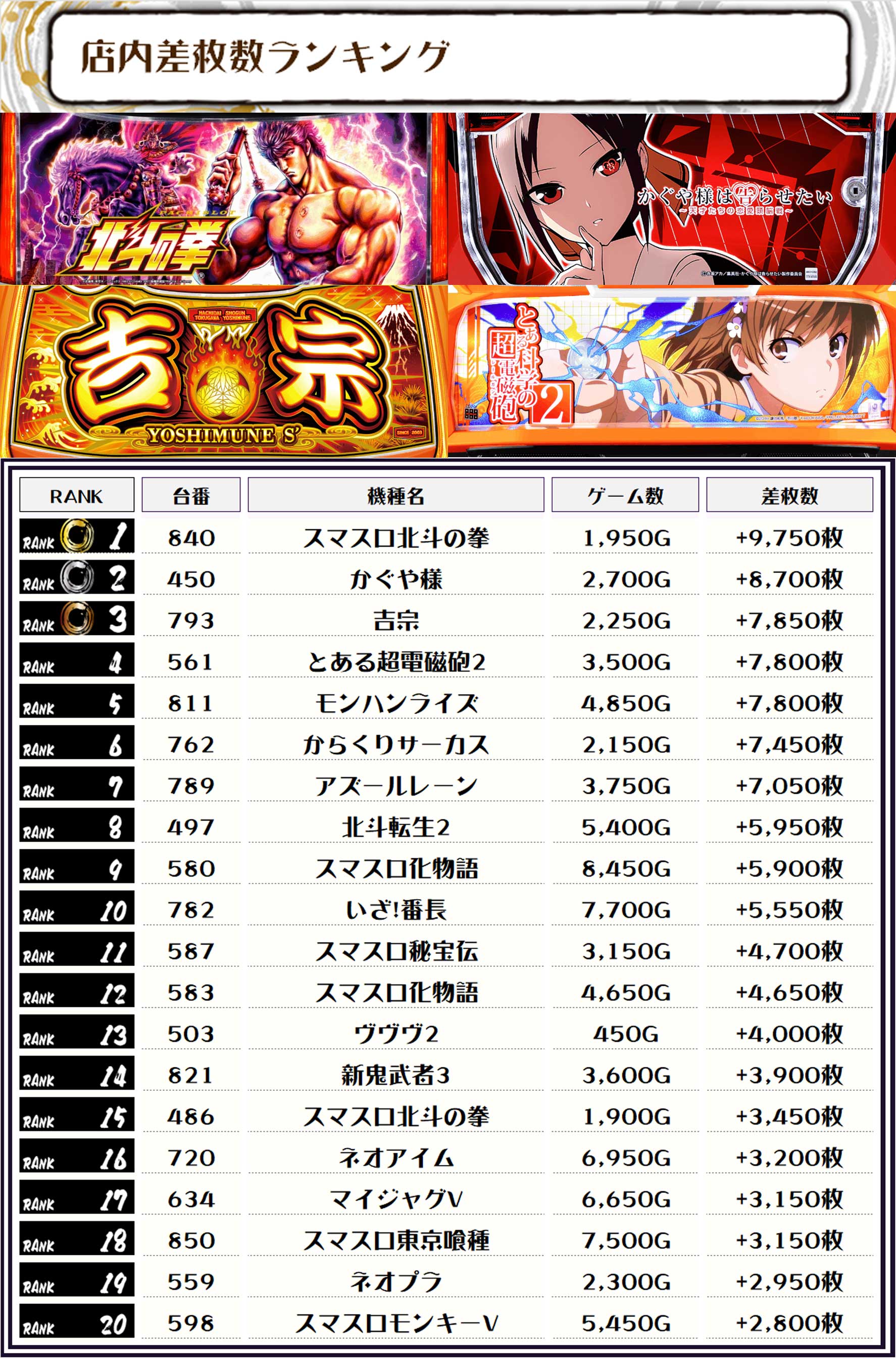 差枚ランキングでTOPに輝いたのは【スマスロ北斗の拳・840番台】で+9,750枚‼️