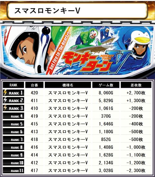 【モンキー】が8,000回転over、+2,700枚と結果を残し
