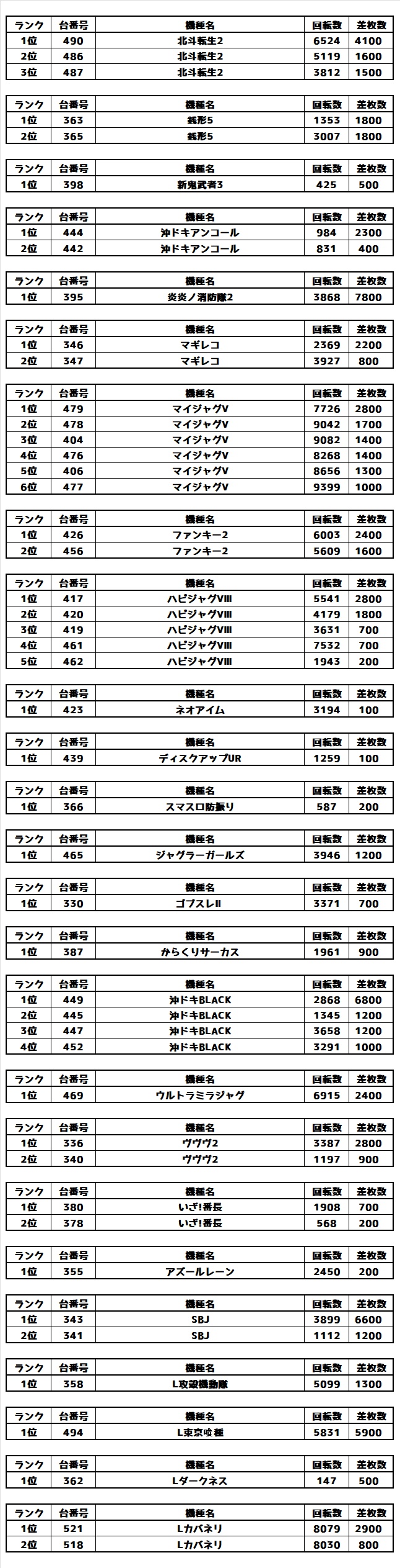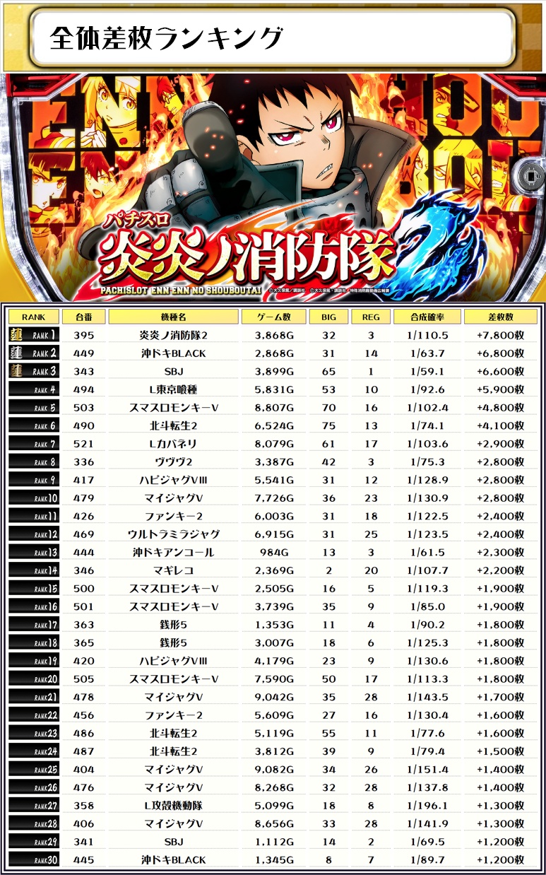 その他機種の差枚ランキング