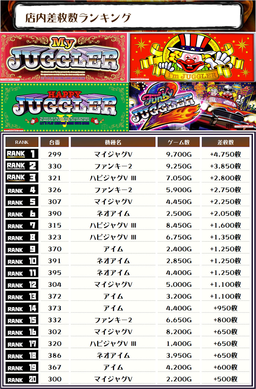 また、2位にはファンキー2・330番台】+3,850枚、3位にはハピジャグVⅢ・321番台】の+2,800枚がランクインっ🤡✨