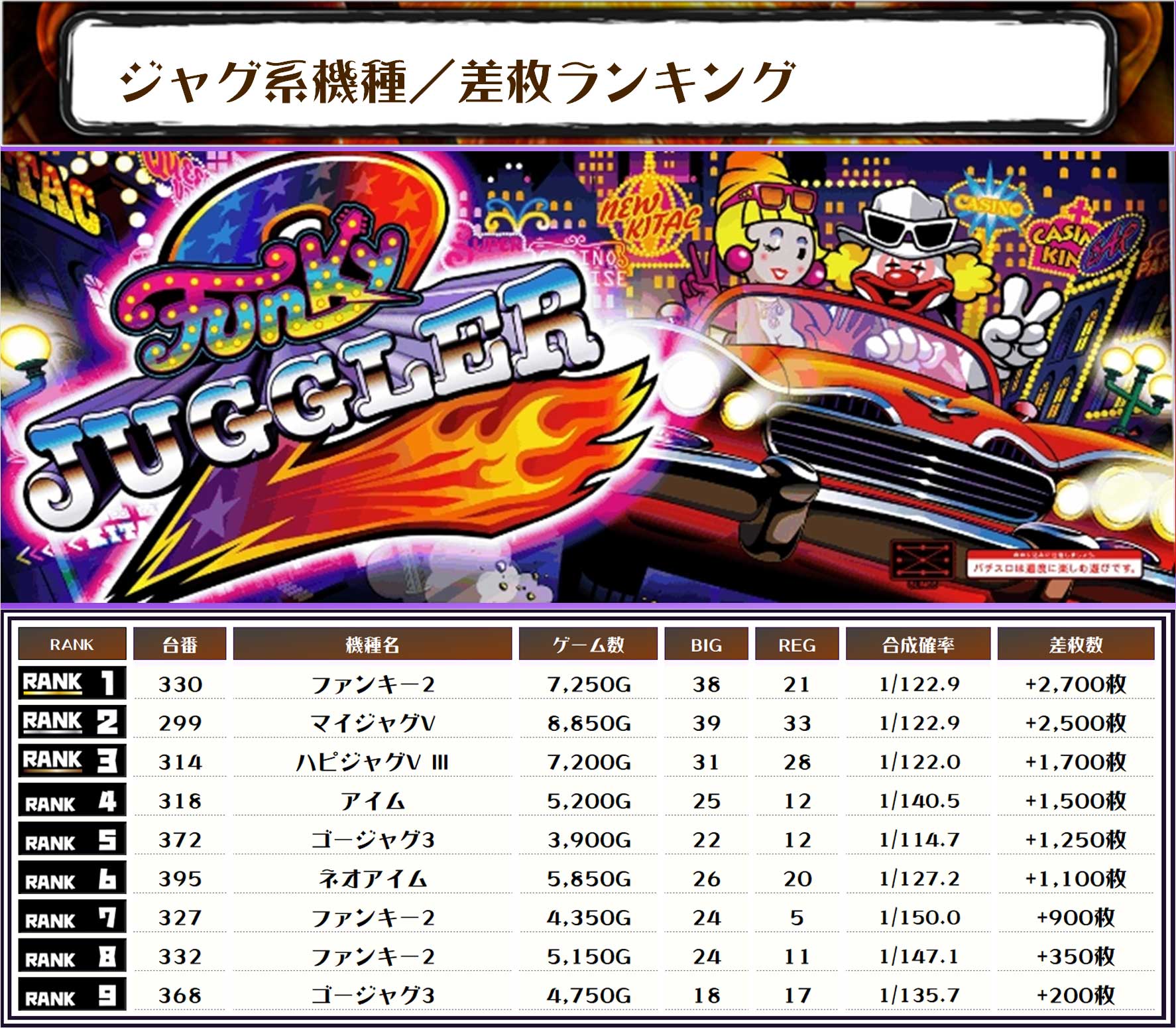 また、2位には【マイジャグV・299番台】の+2,500枚、そして3位には【ハピジャグV Ⅲ・314番台】の+1,700枚がランクインっ🤡✨