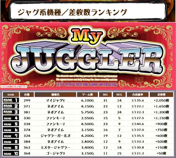 この日のトップ差枚は【マイジャグV・299番台】で+2,050枚👍👑👑👑
