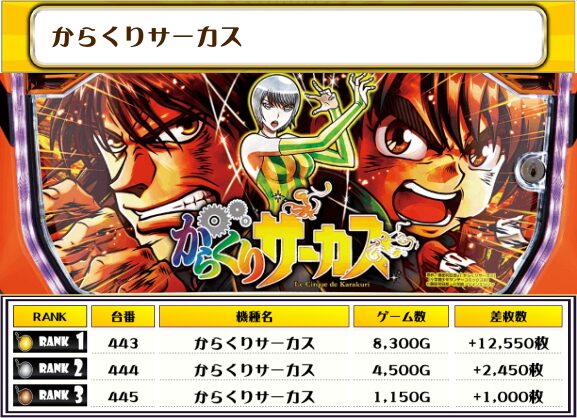 この日、全体の差枚トップに輝いたのは【からくりサーカス・443番台】の+12,550枚‼️