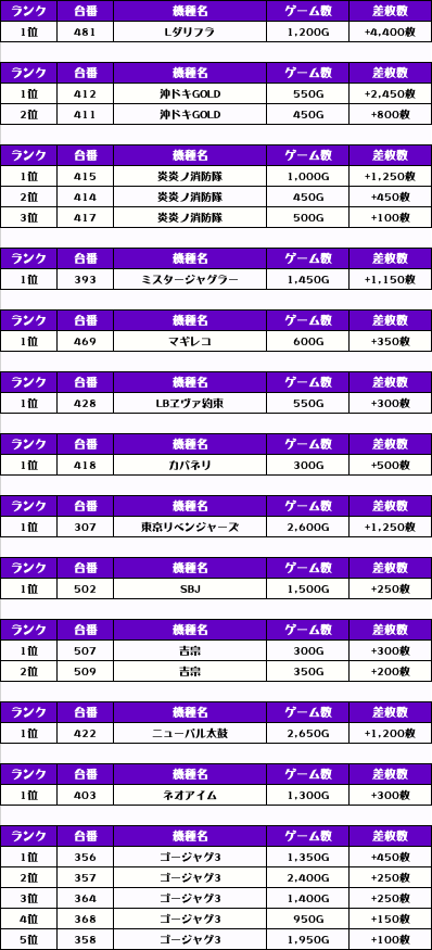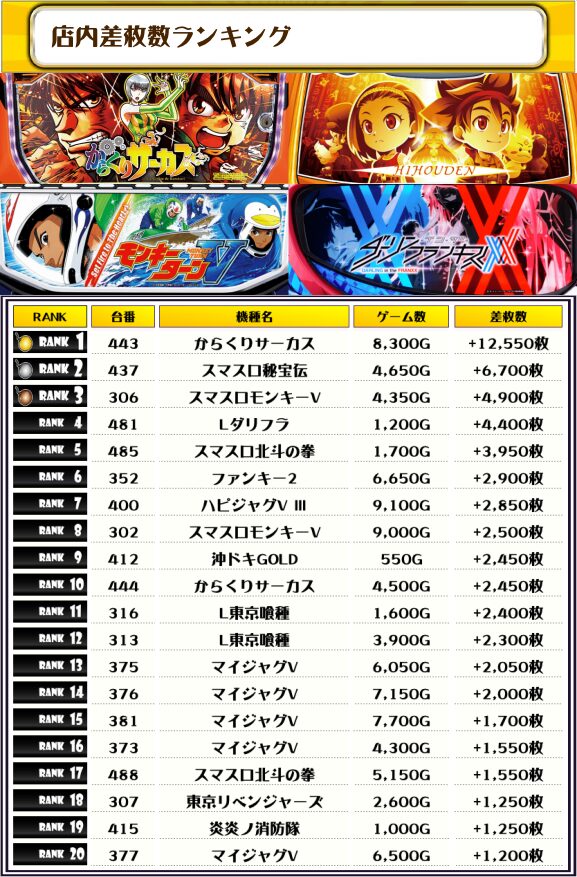 最後に【店内全台の差枚ランキング】をどぞ~👍