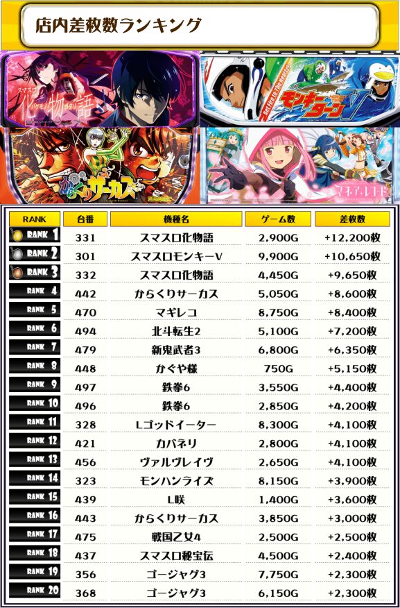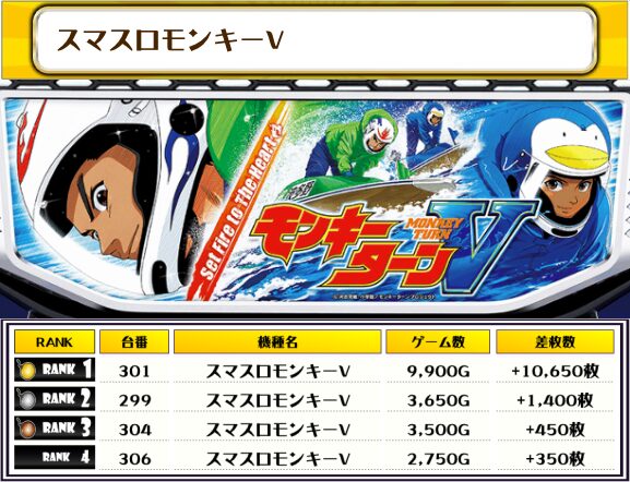 2位には【スマスロモンキーV・301番台】の+10,650枚、3位には【スマスロ化物語・332番台】の+9,650枚がランクインっ🏆🏆🏆🏆