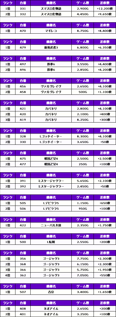 最後に【店内全台の差枚ランキング】をどぞ~👍