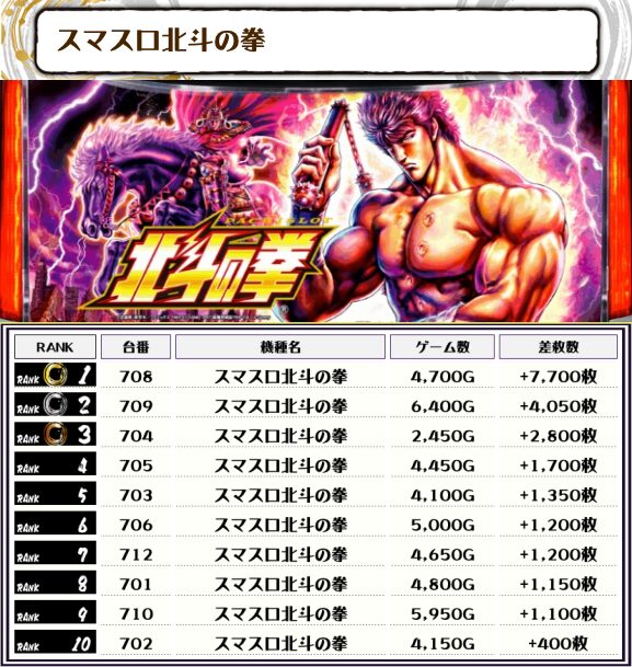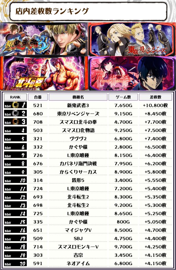2位には【東京リベンジャーズ・680番台】の+8,450枚、そして3位には【スマスロ北斗の拳・708番台】の+7,700枚がランクインっ🏆🏆🏆🏆