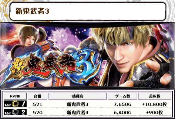 この日、全体の差枚トップに輝いたのは【新鬼武者3・521番台】で+10,800枚‼️