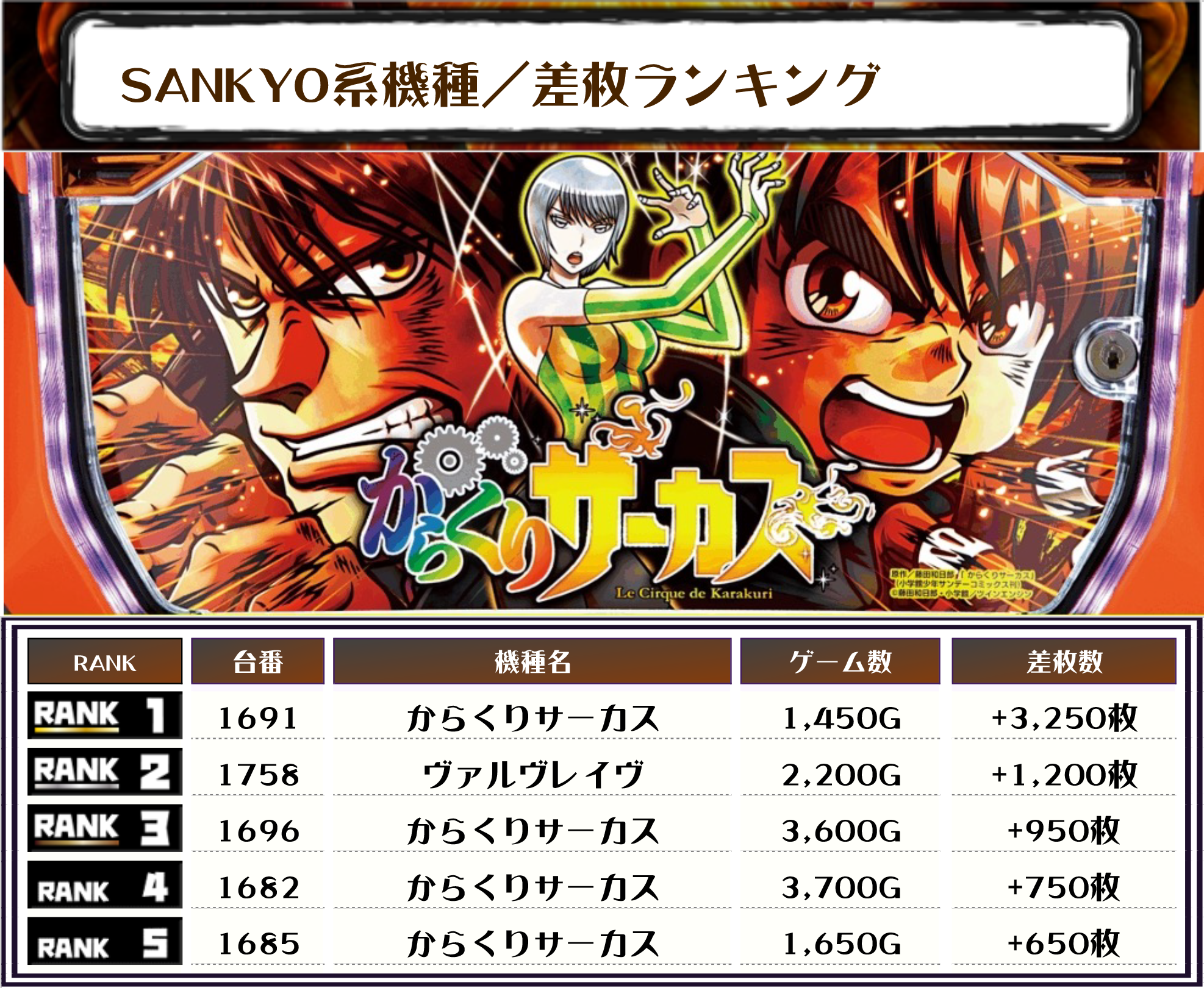 ということで、この日のトップ差枚は【からくりサーカス・1691番台】の+3,250枚✨️