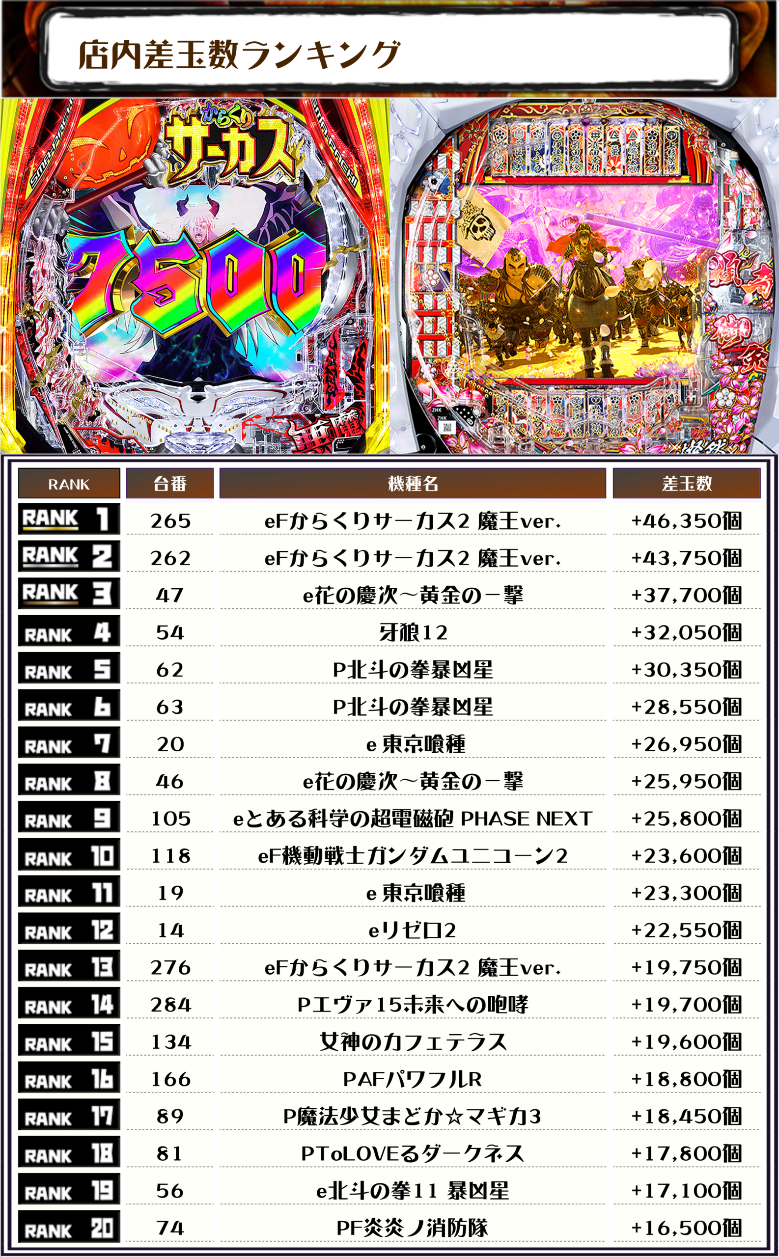また、同じく2位にも【eFからくりサーカス2 魔王ver.・262番台】の+43,750発、3位には【e花の慶次〜黄金の一撃・47番台】の+37,700発がランクインしました🏆