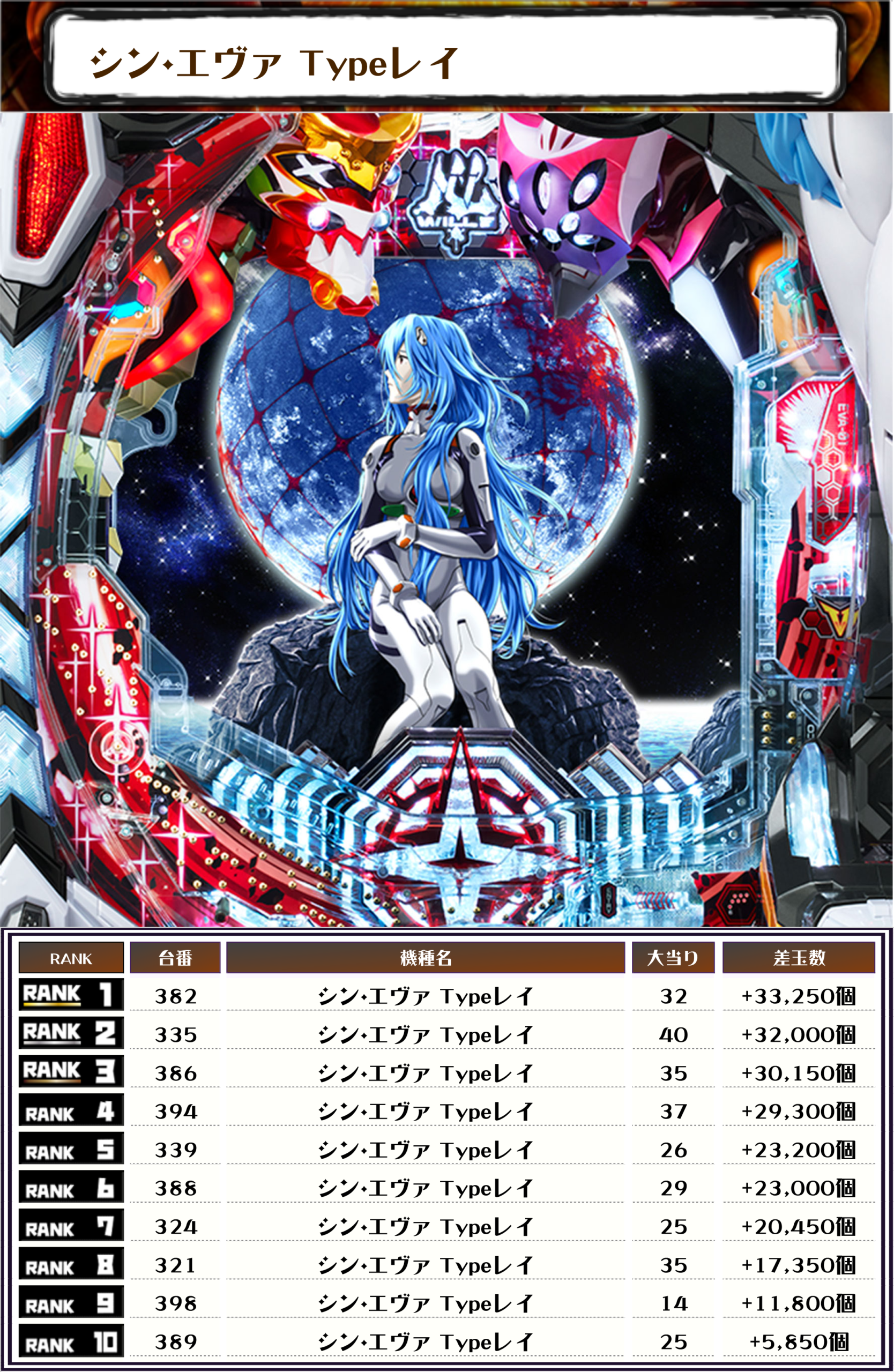 また、2位にはシン・エヴァ Typeレイ・382番台+33,250発、3位にはシン・エヴァ Typeレイ・335番台】の+32,000発がランクインしました🏆