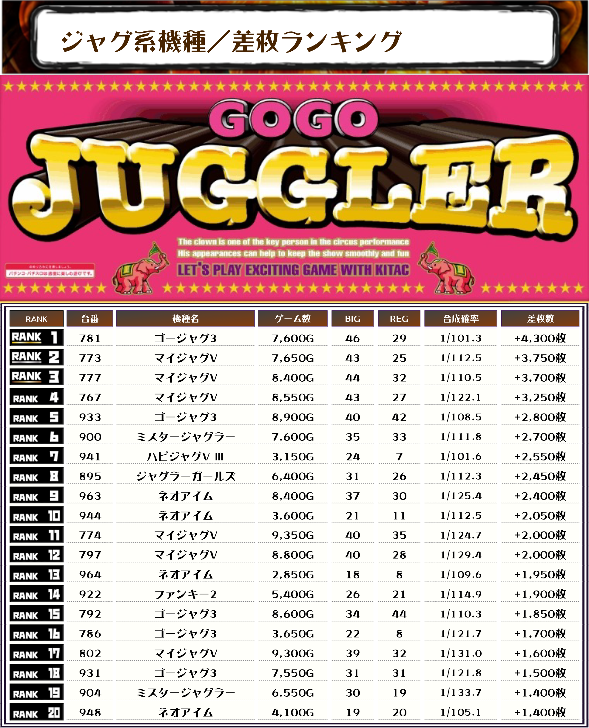 また、2位にはマイジャグV・773番台】+3,750枚、3位にも【マイジャグV・777番台】の+3,700枚がランクインしました🏆