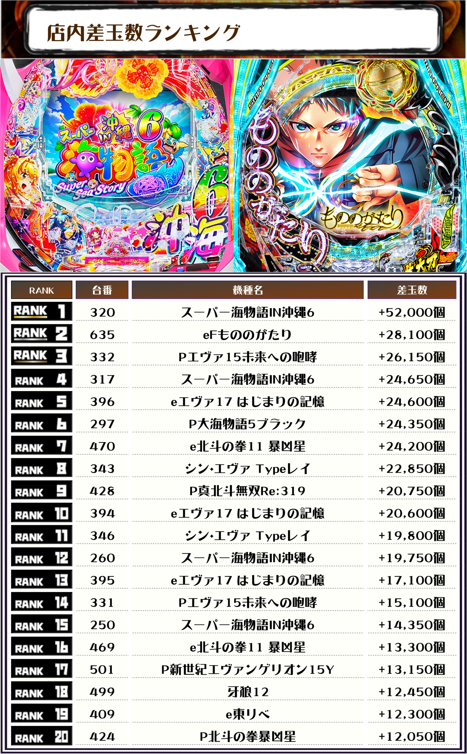 ということで、この日のトップ出玉は【スーパー海物語IN沖縄6・320番台】の+52,000発っ👑