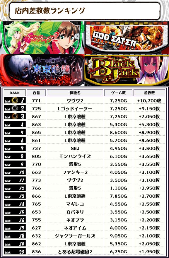 続く2位には【Lゴッドイーター・725番台】の+9,150枚、そして3位には【L東京喰種・867番台】の+7,050枚がランクインしましたーっ🏆🏆🏆