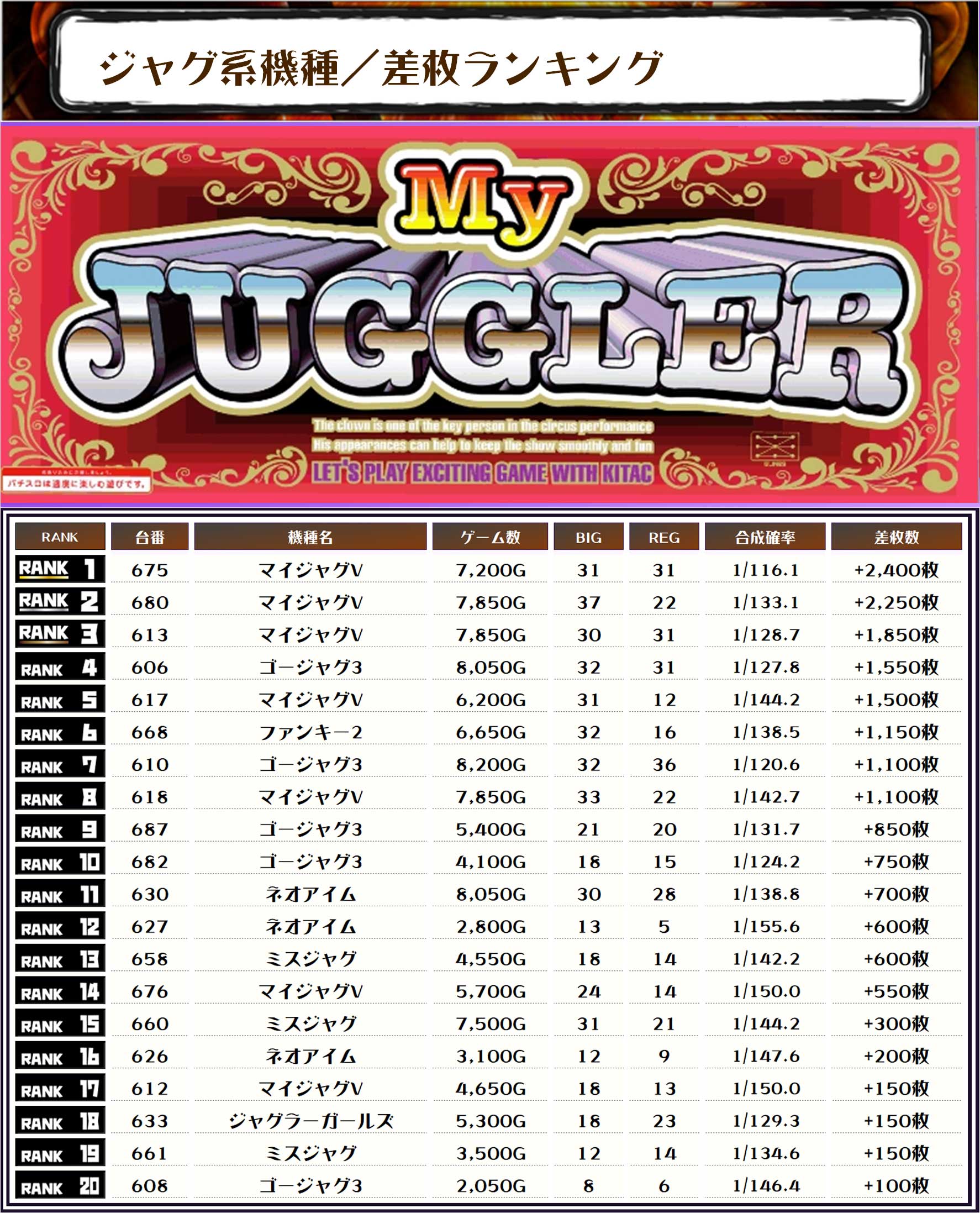 全体のTOP差枚は【マイジャグV・675番台】で+2,400枚👍