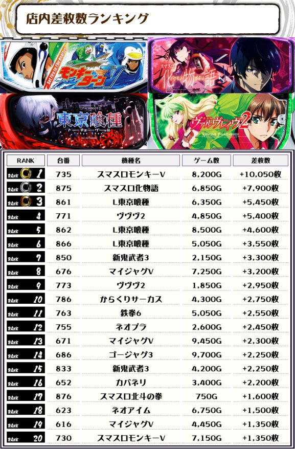 続く2位には【スマスロ化物語・875番台】の+7,900枚、そして3位には【L東京喰種・861番台】の+5,450枚がランクインしましたーっ🏆🏆🏆