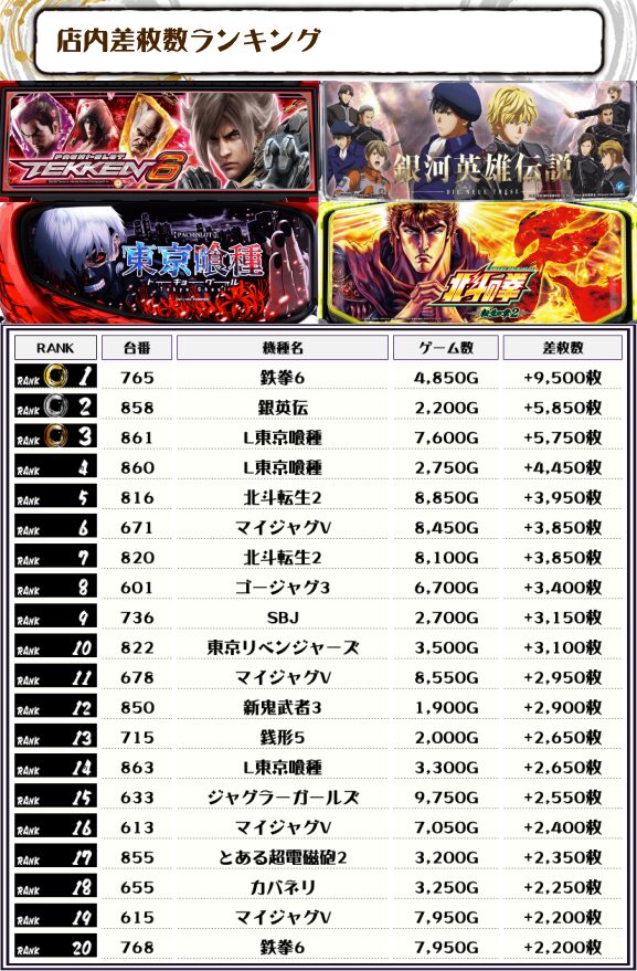 続く2位には【銀英伝・858番台】の+5,850枚、そして3位には【L東京喰種・861番台】の+5,750枚がランクインしましたーっ🏆🏆🏆