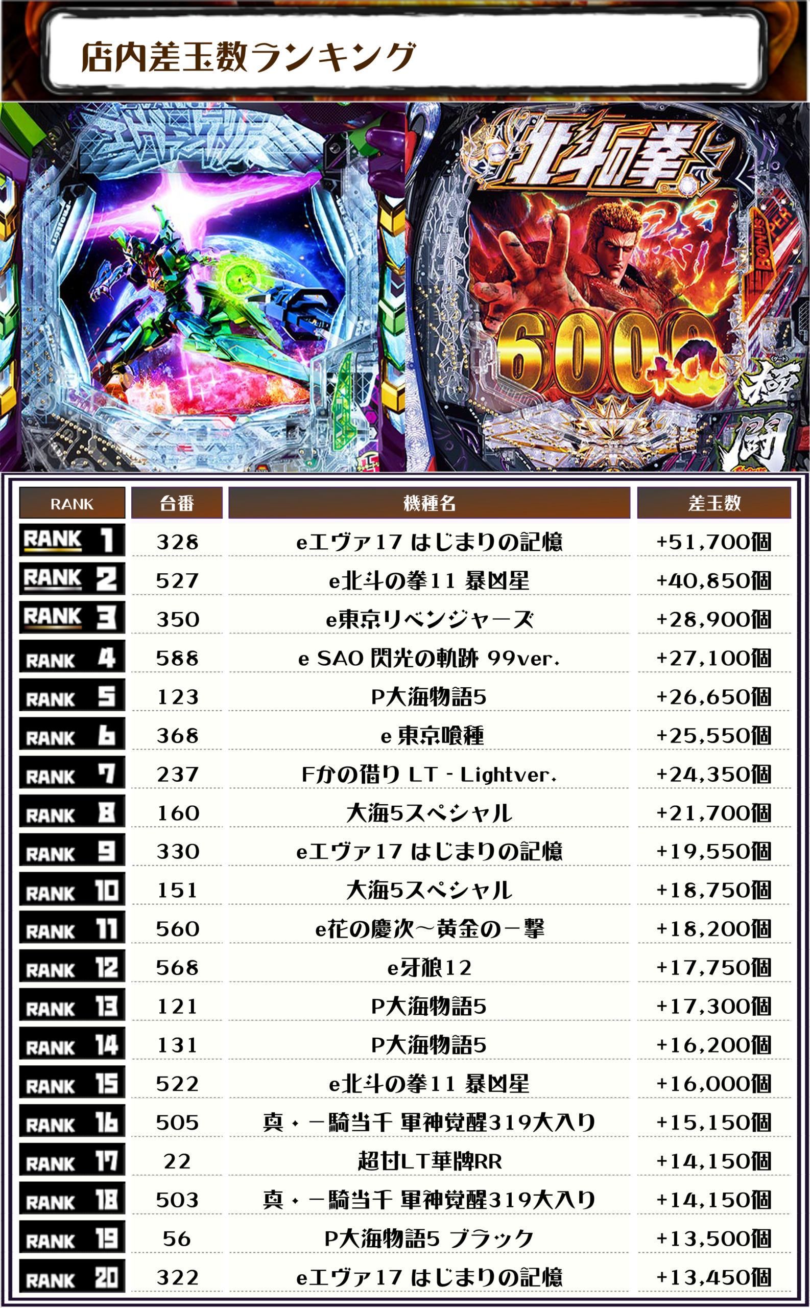 ということで、この日のトップ出玉は【eエヴァ17 はじまりの記憶・328番台】の+51,700発っ👑