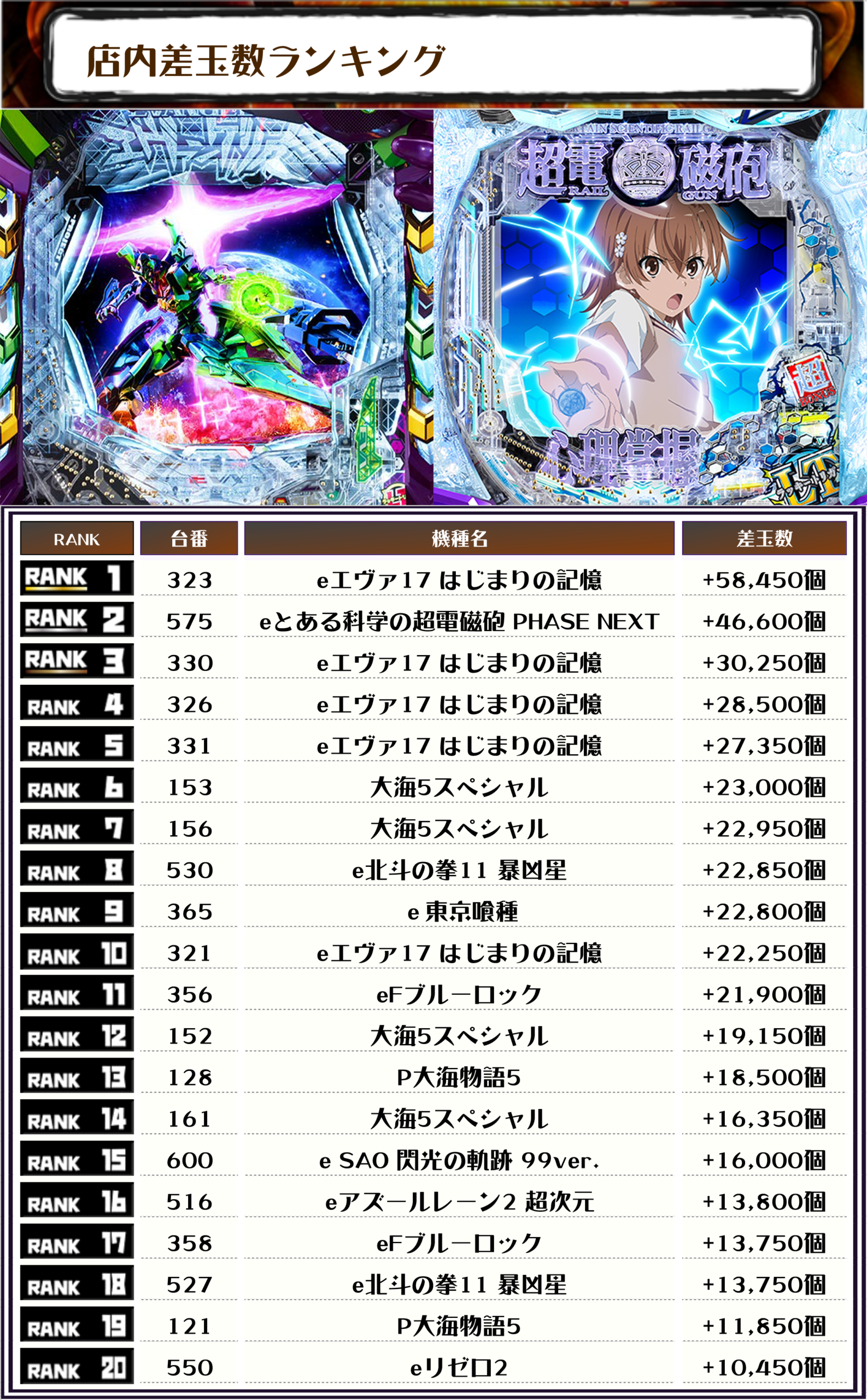 また、2位にはeとある科学の超電磁砲 PHASE NEXT・575番台+46,600発、3位にはeエヴァ17 はじまりの記憶・330番台】の+30,250発がランクインしました🏆