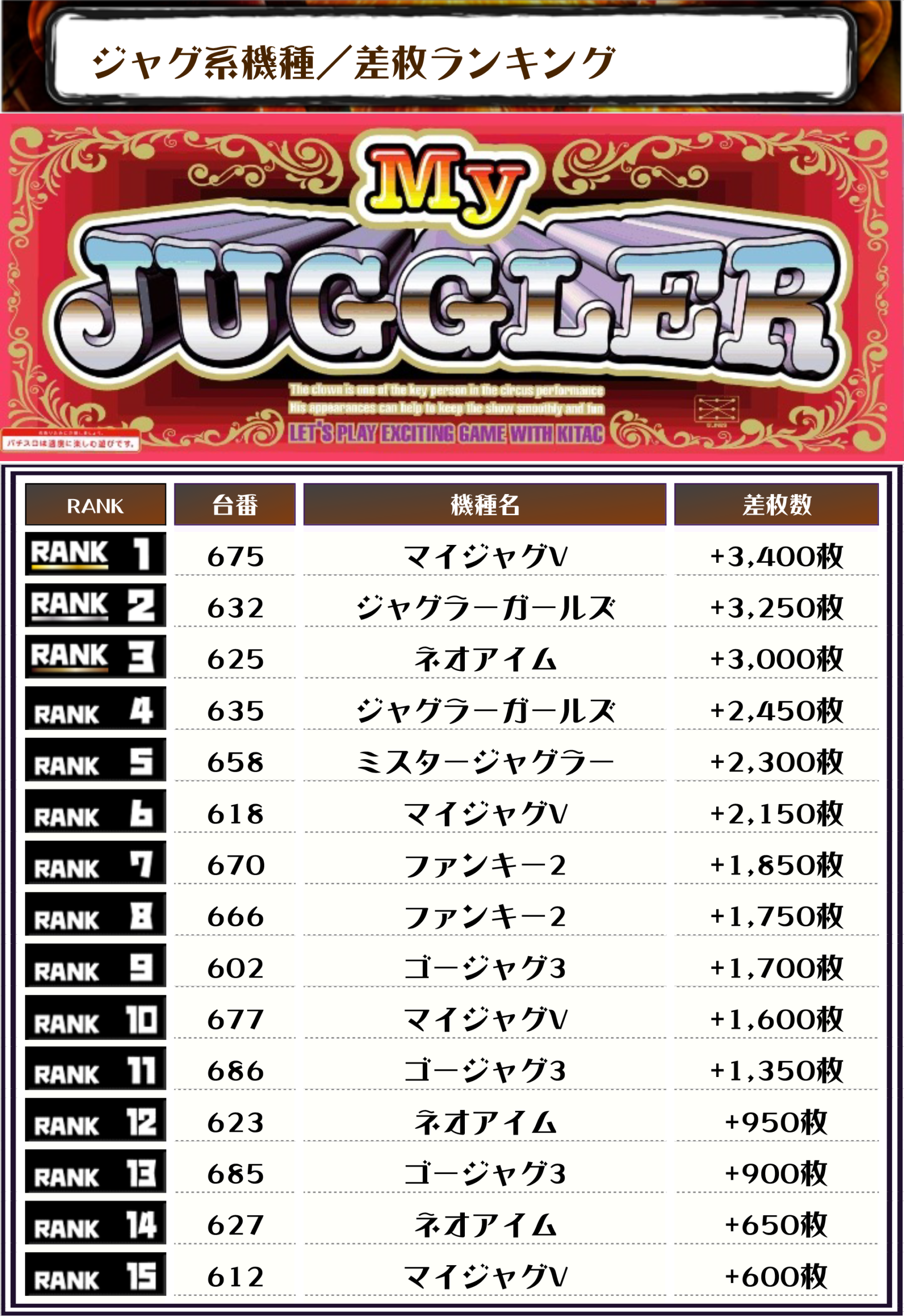 前回はマイジャグVとゴージャグ3が多数ランクインしていましたが、今回は少数設置であるジャグラーガールズやファンキー2も目立つようなランキングとなりました‼️