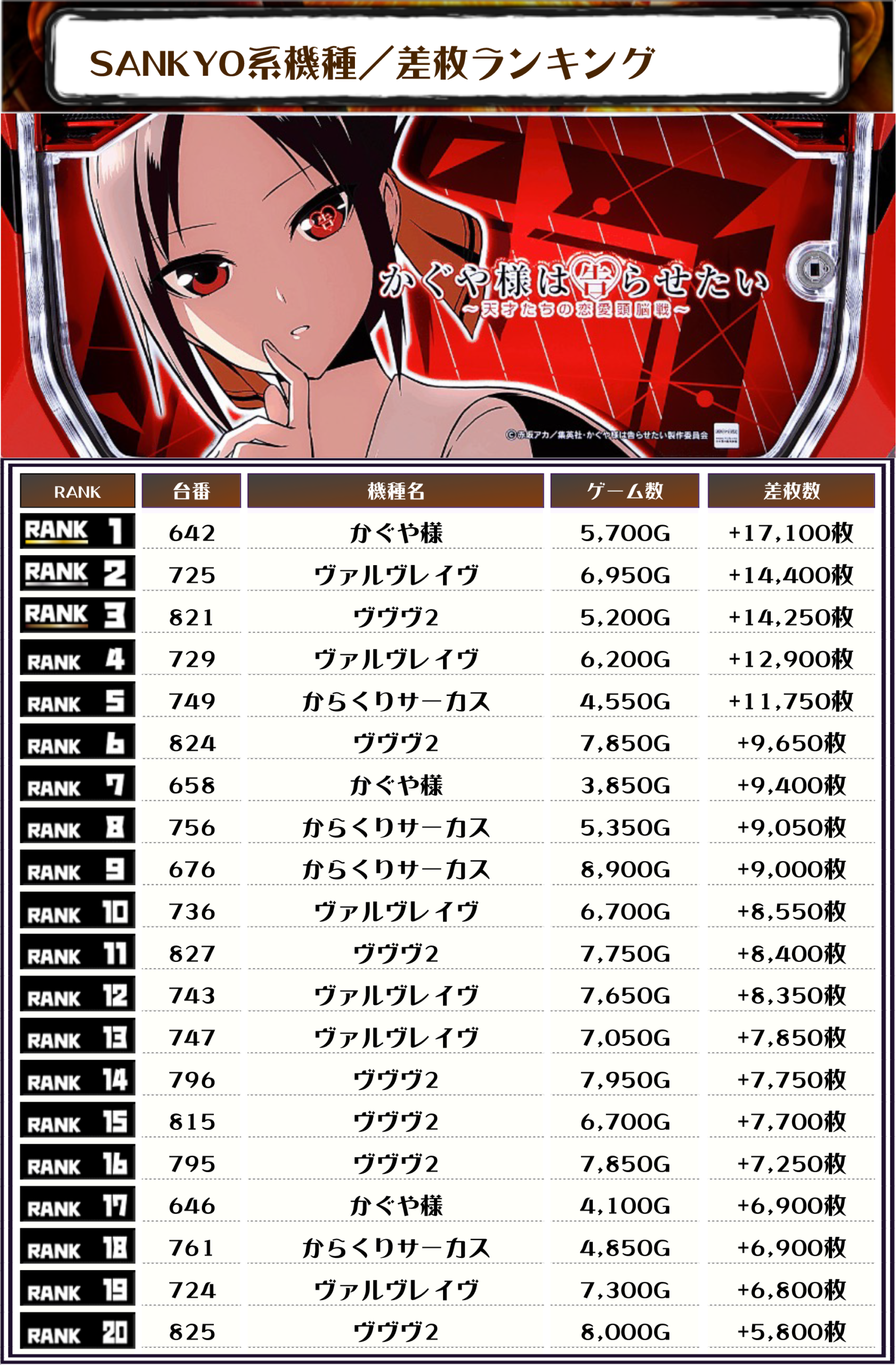 ということで、この日のトップ差枚は【かぐや様・642番台】で+17,100枚‼️