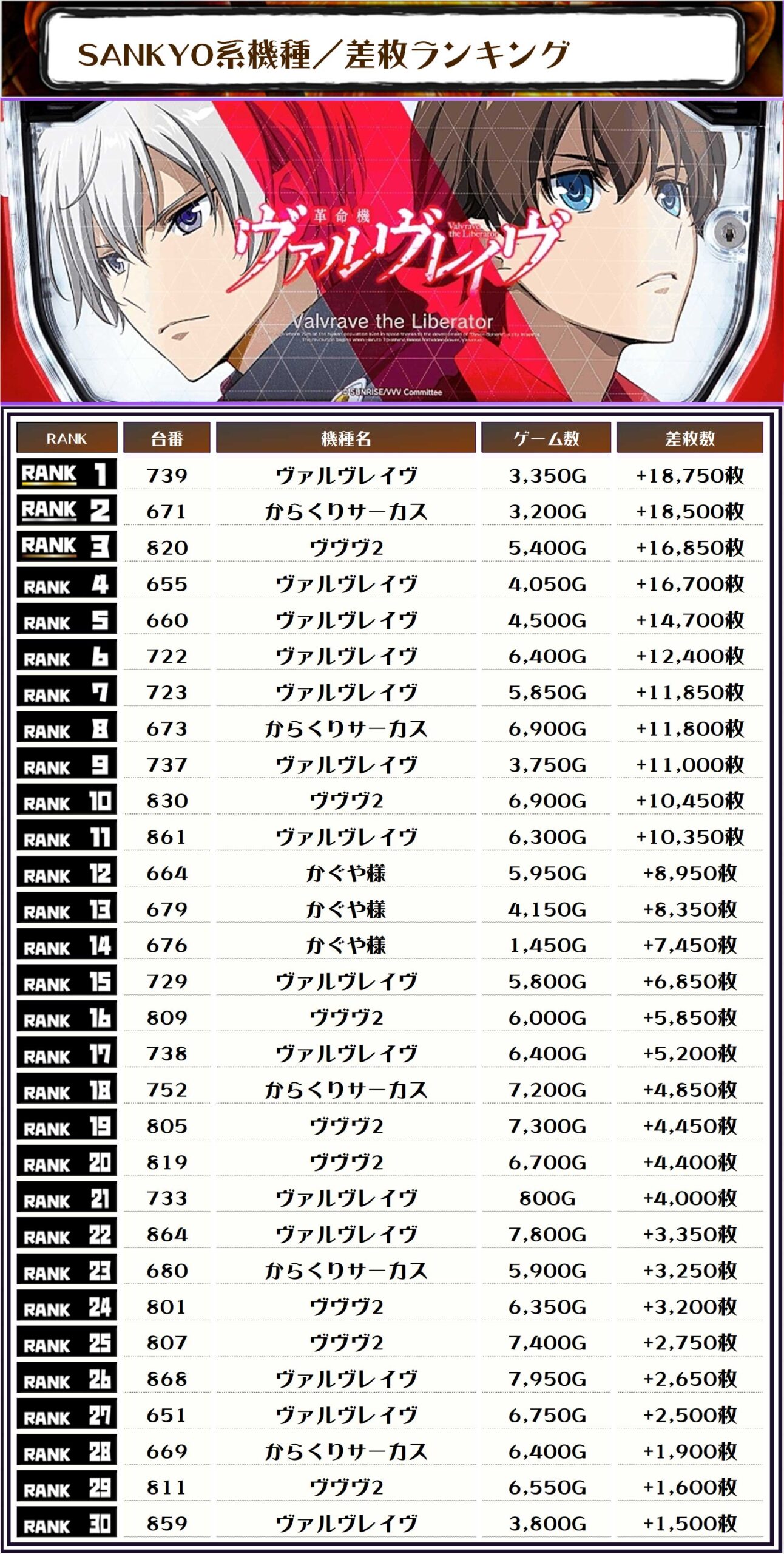 2位には【からくりサーカス・671番台】の+18,500枚、そして3位には【ヴヴヴ2・820番台】の+16,850枚がランクインっ‼️