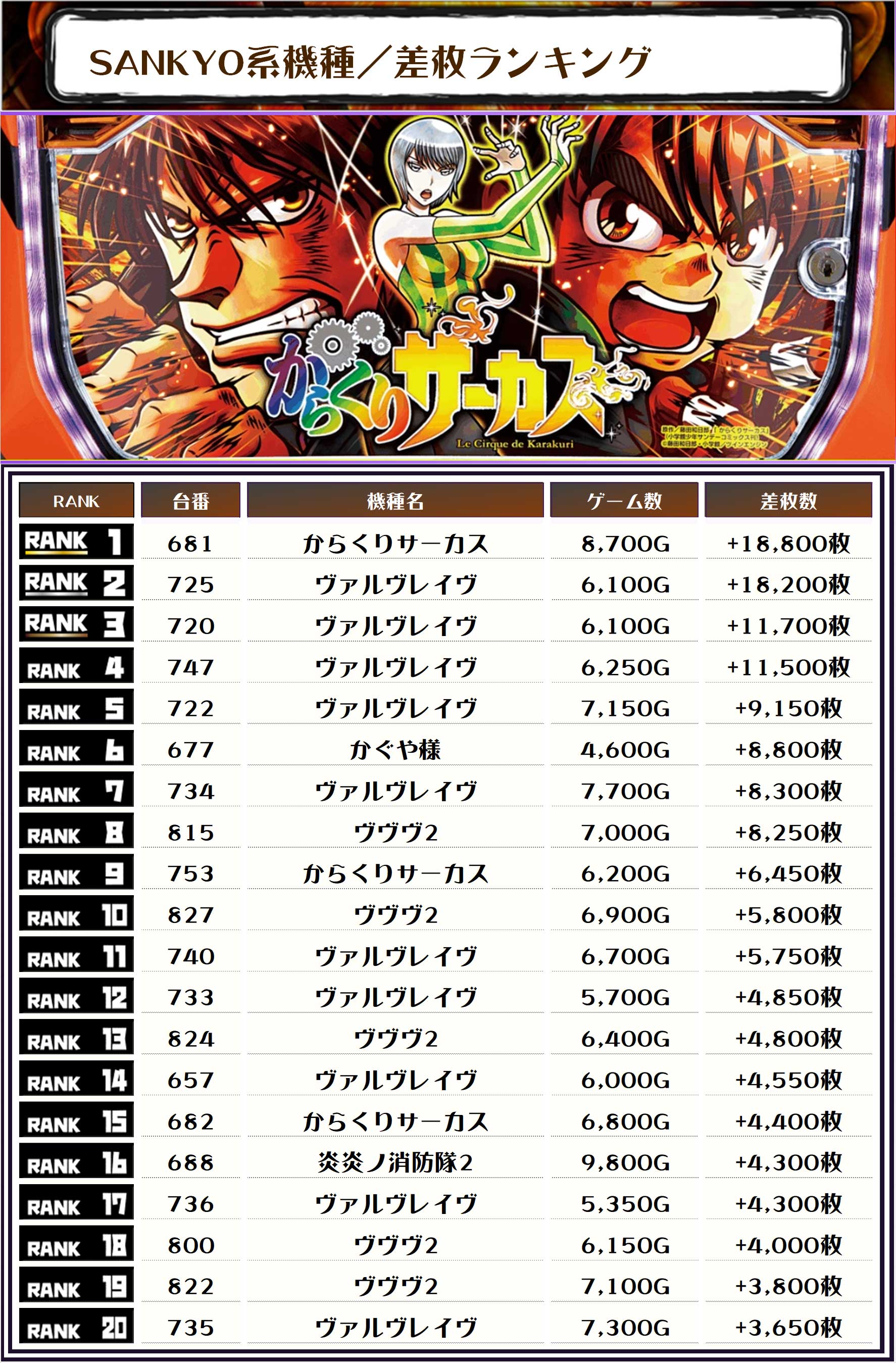 ということで、この日のトップ差枚は【からくりサーカス・681番台】で+18,800枚‼️