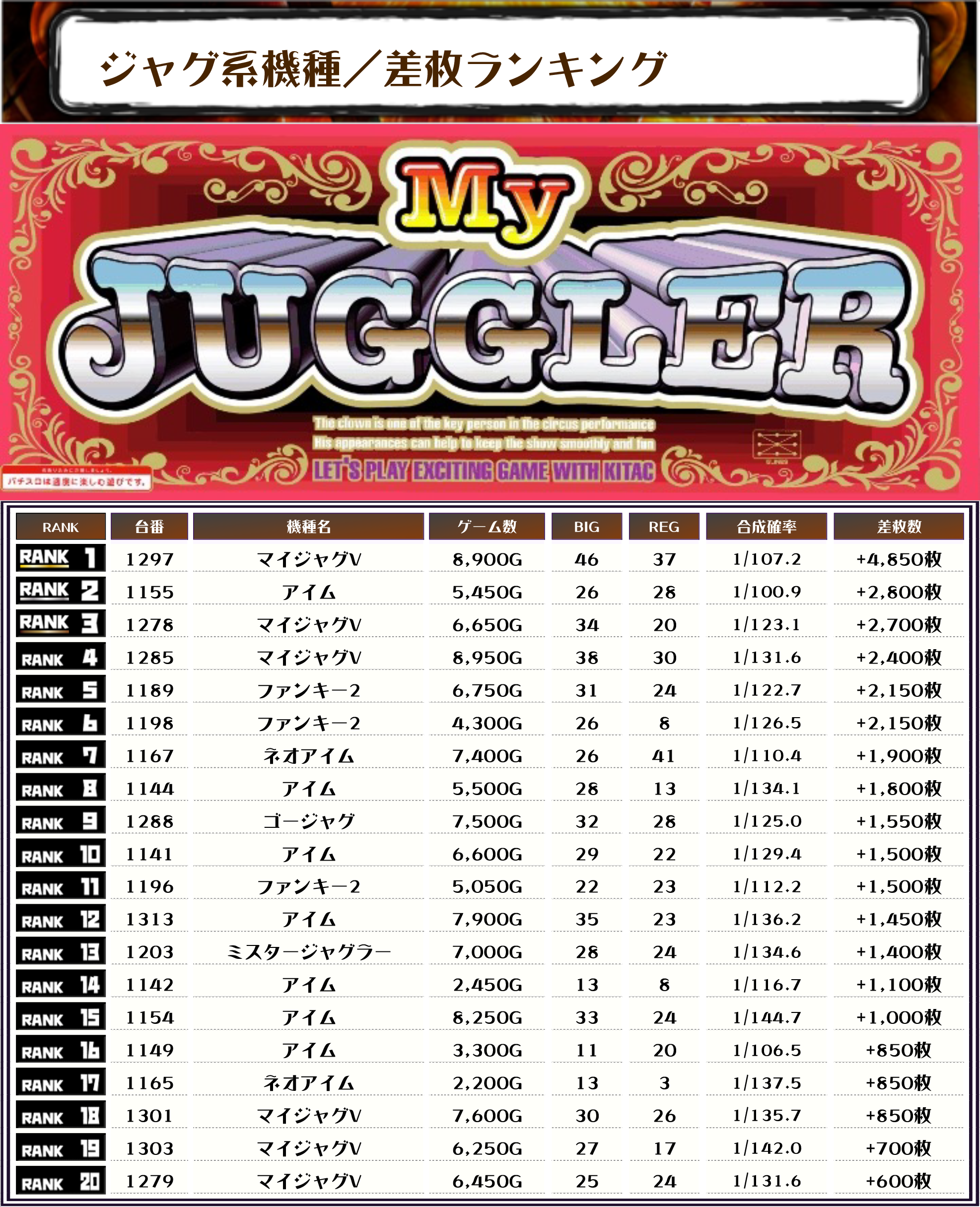 また、2位は【アイム・1155番台】の+2,800枚、3位には【マイジャグV・1278番台】の+2,700枚がランクイン‼️
