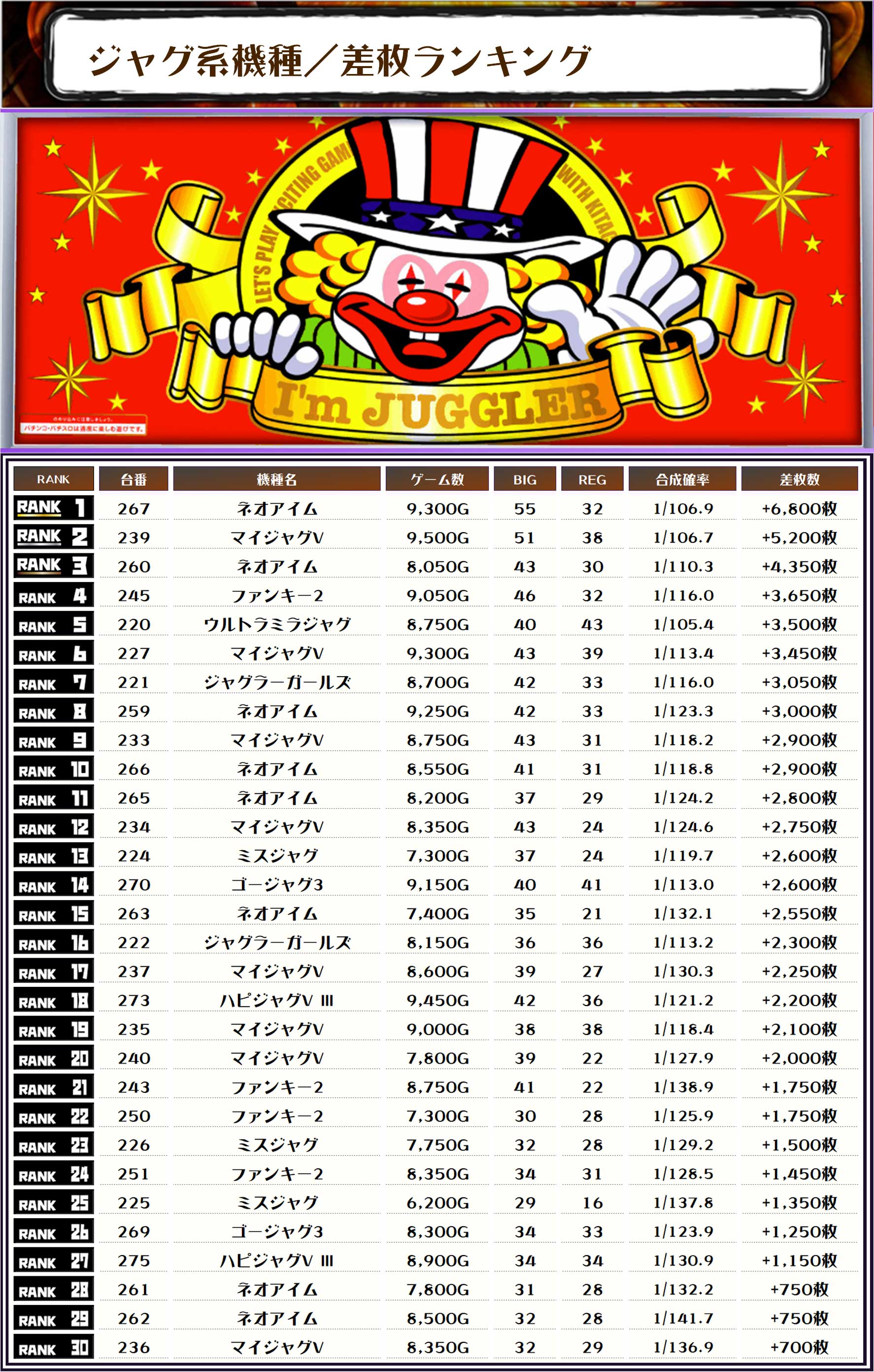 また、2位には【マイジャグV・239番台】の+5,200枚、そして3位には【ネオアイム・260番台】の+4,350枚がランクインしました🏆