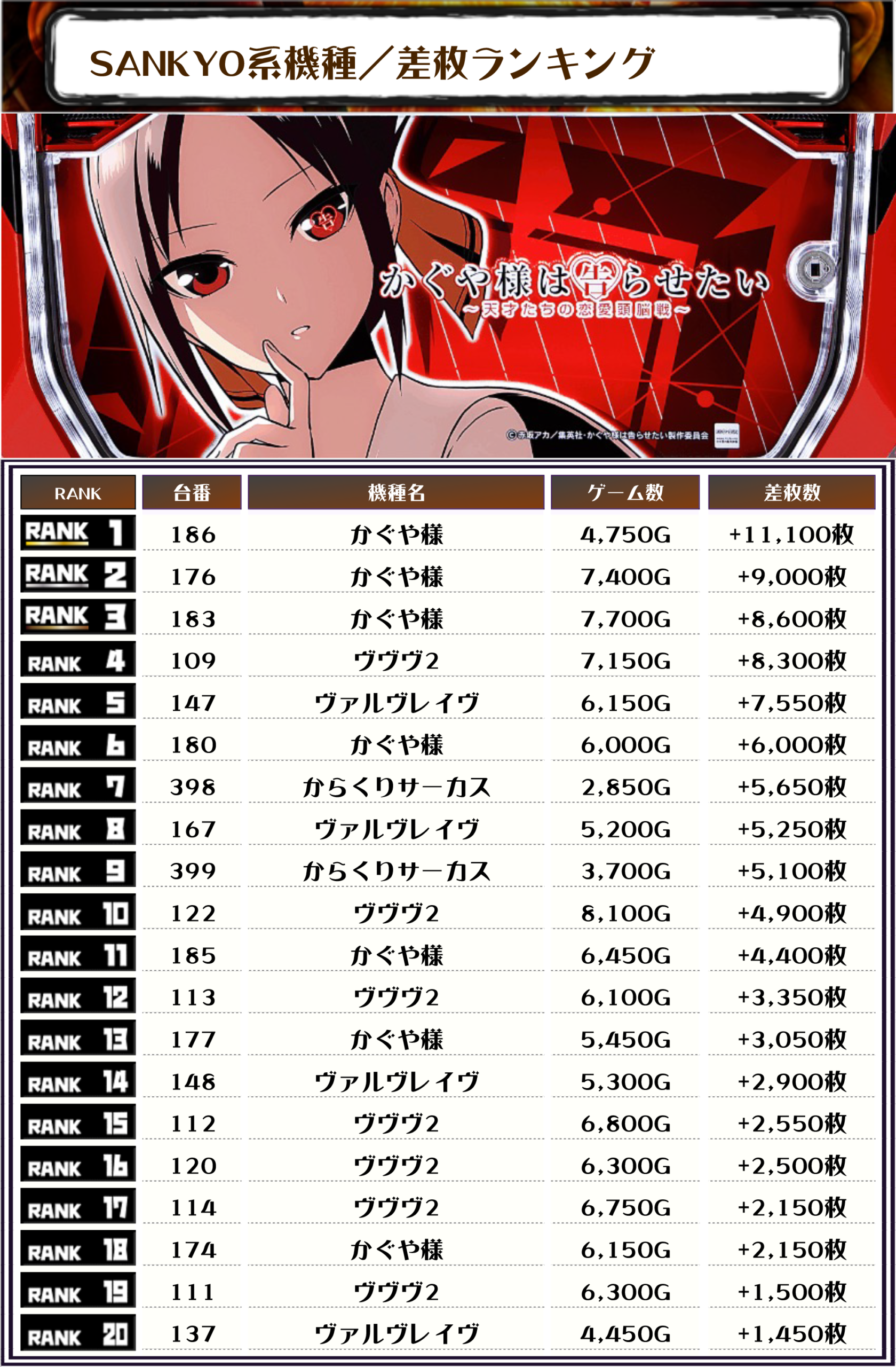続く2位にも【かぐや様・176番台】の+9,000枚、そして3位にも【かぐや様・183番台】の+8,600枚がランクインっ‼️