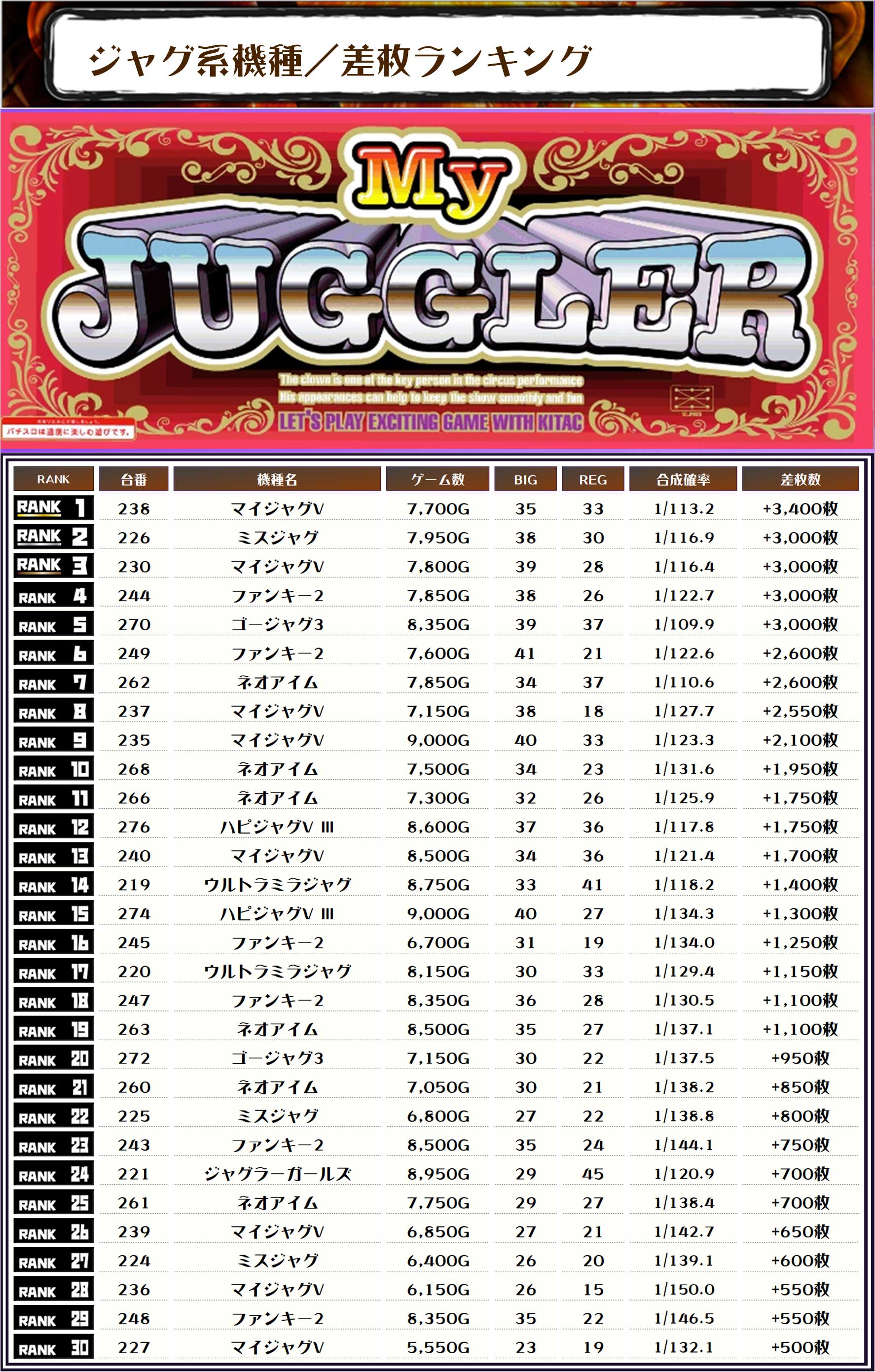 また、2位には【ミスジャグ・226番台】の+3,000枚、そして3位には同率で【マイジャグV・230番台】の+30,00枚がランクインしました🏆