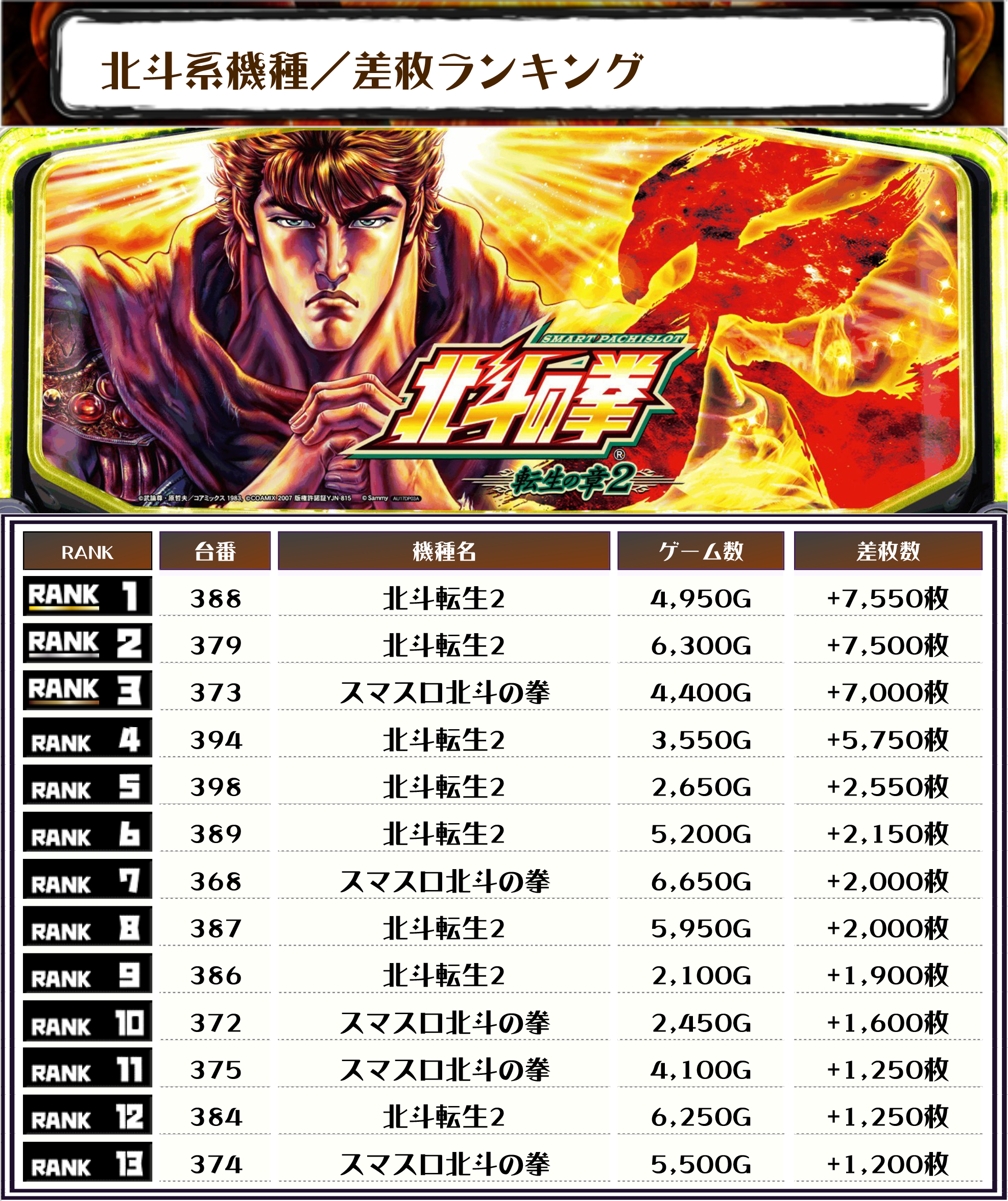 また、2位にも同じく【北斗転生2・379番台】の+7,500枚、そして3位には【スマスロ北斗の拳・373番台】の+7,000枚がランクインですっ❗️🏆