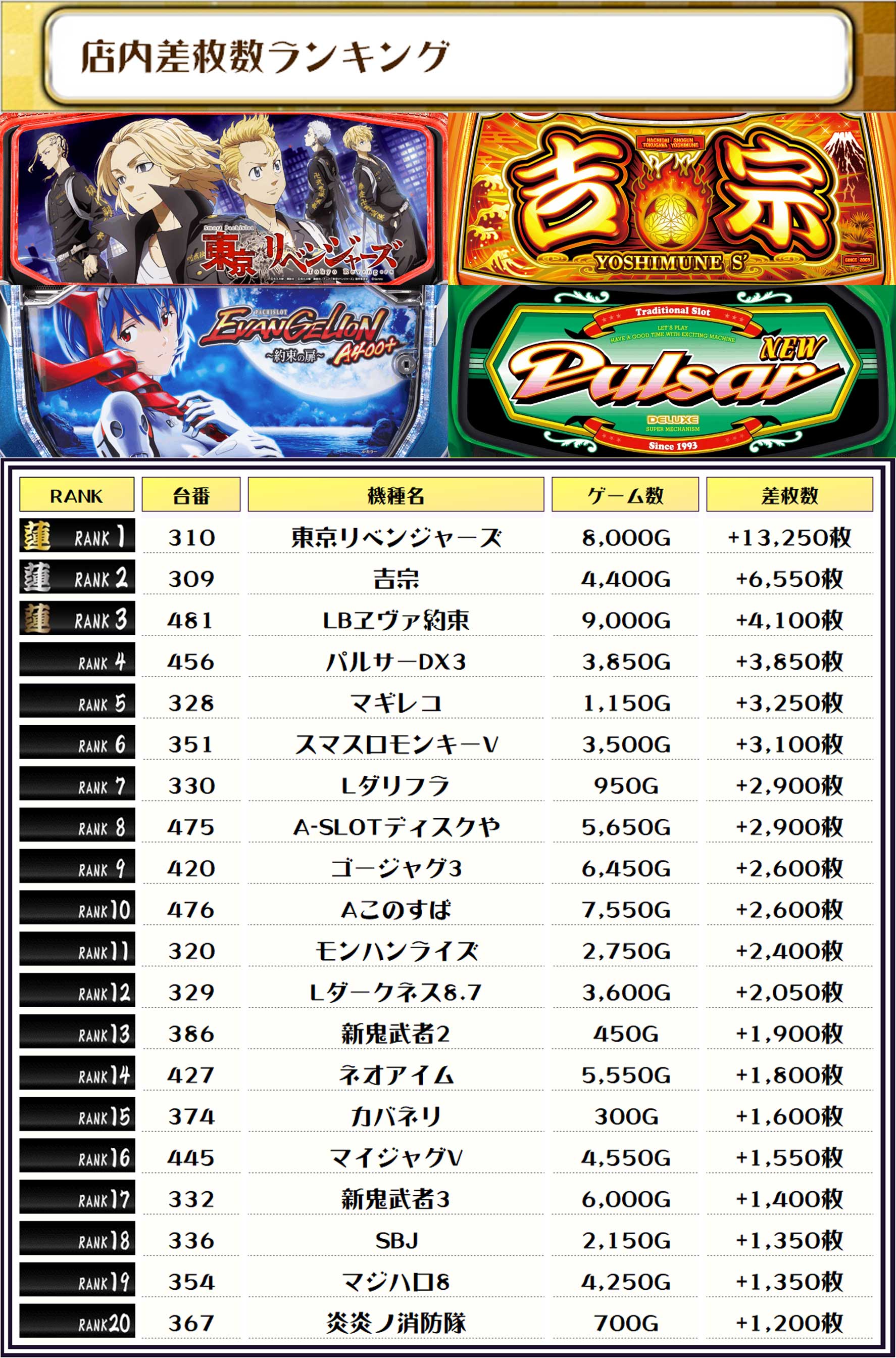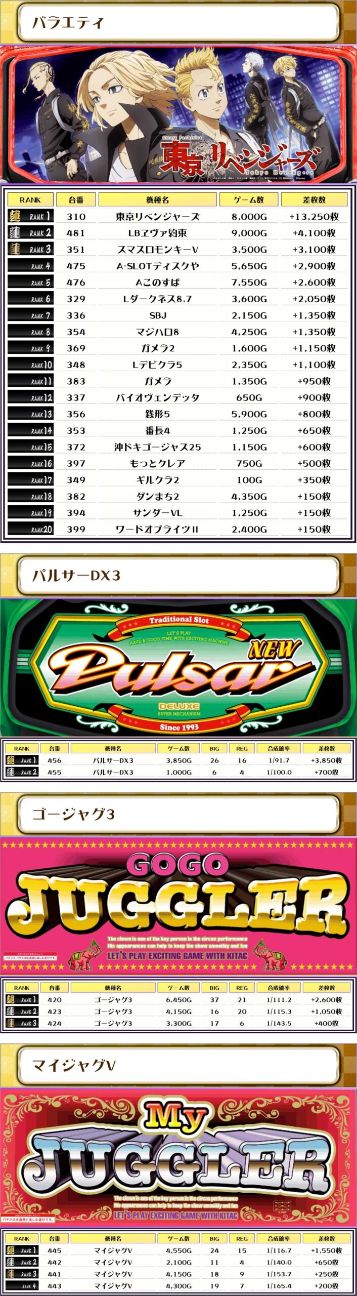 この日、全体の差枚トップに輝いたのは【東京リベンジャーズ・310番台】で+13,250枚‼️