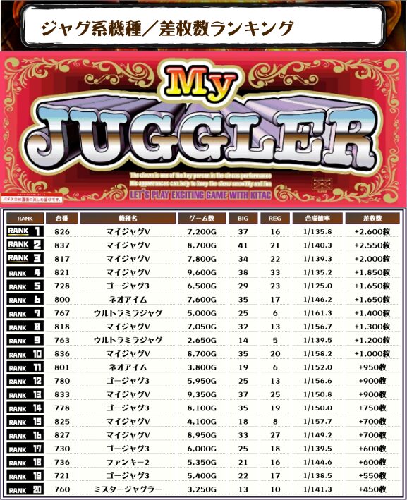 全体的にもマイジャグVが多くランクインしてているので、優秀台が多かったのかもしれませんね!